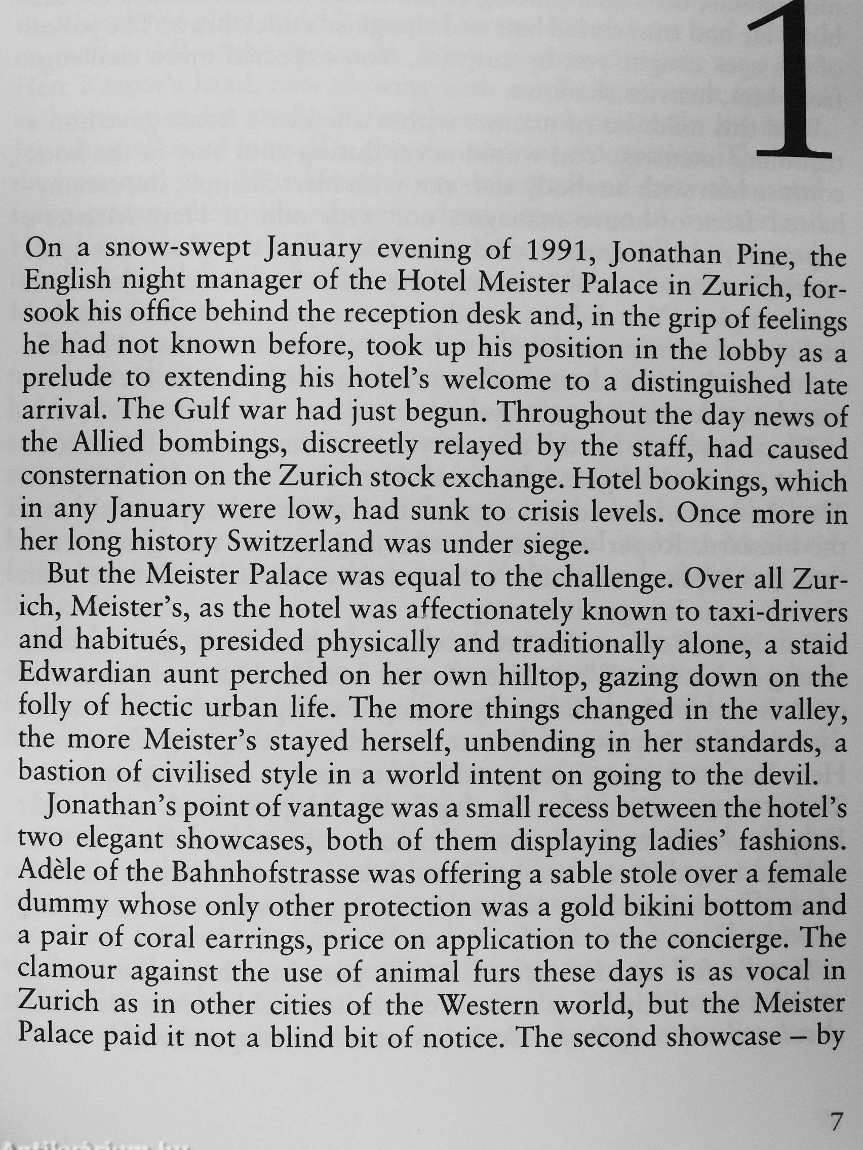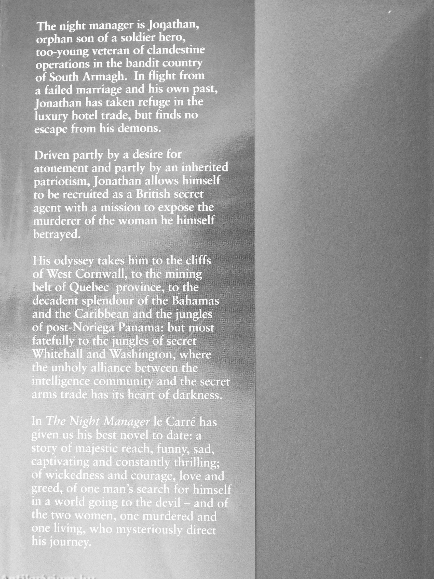 The night manager is Joijathan,^^^^ orphan son of a soldier hero, too-young veteran of clandestiheMW operations in the bandit country of South Armagh, hi flight from V a failed marriage and his own past, Jonathan has taken refuge in the luxury hotel trade, but finds no escape from his demons.