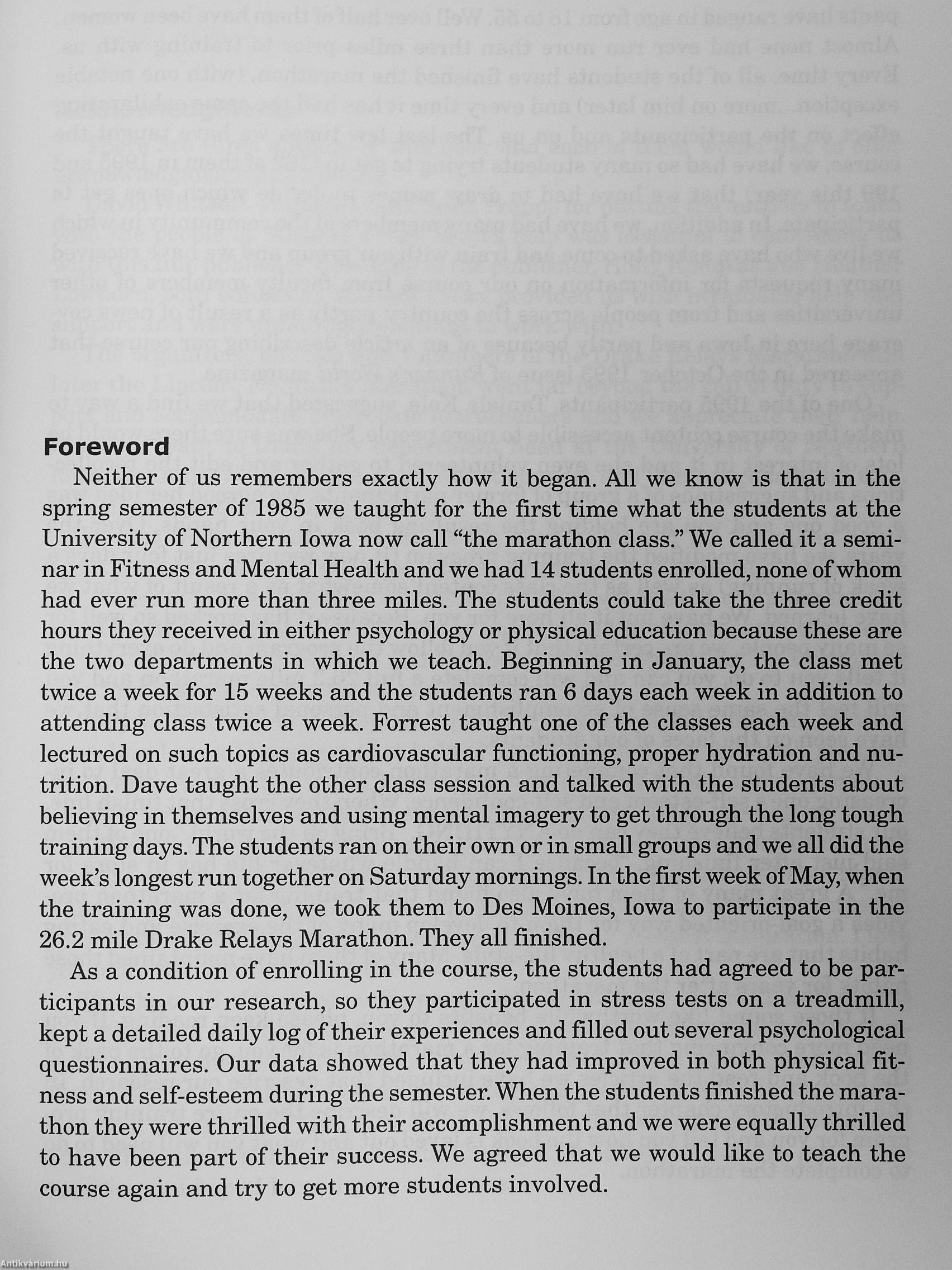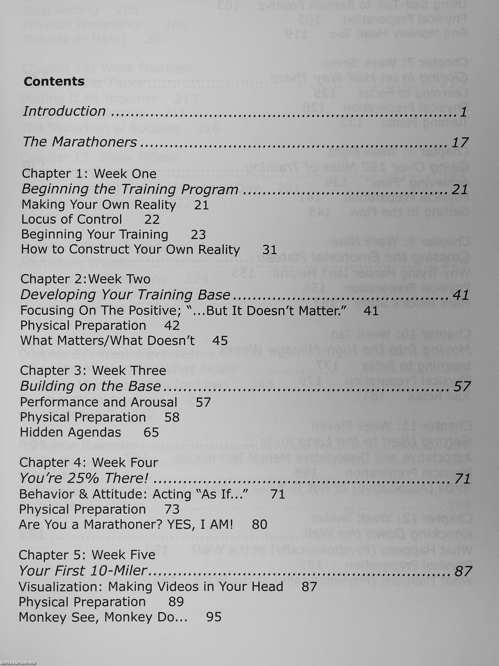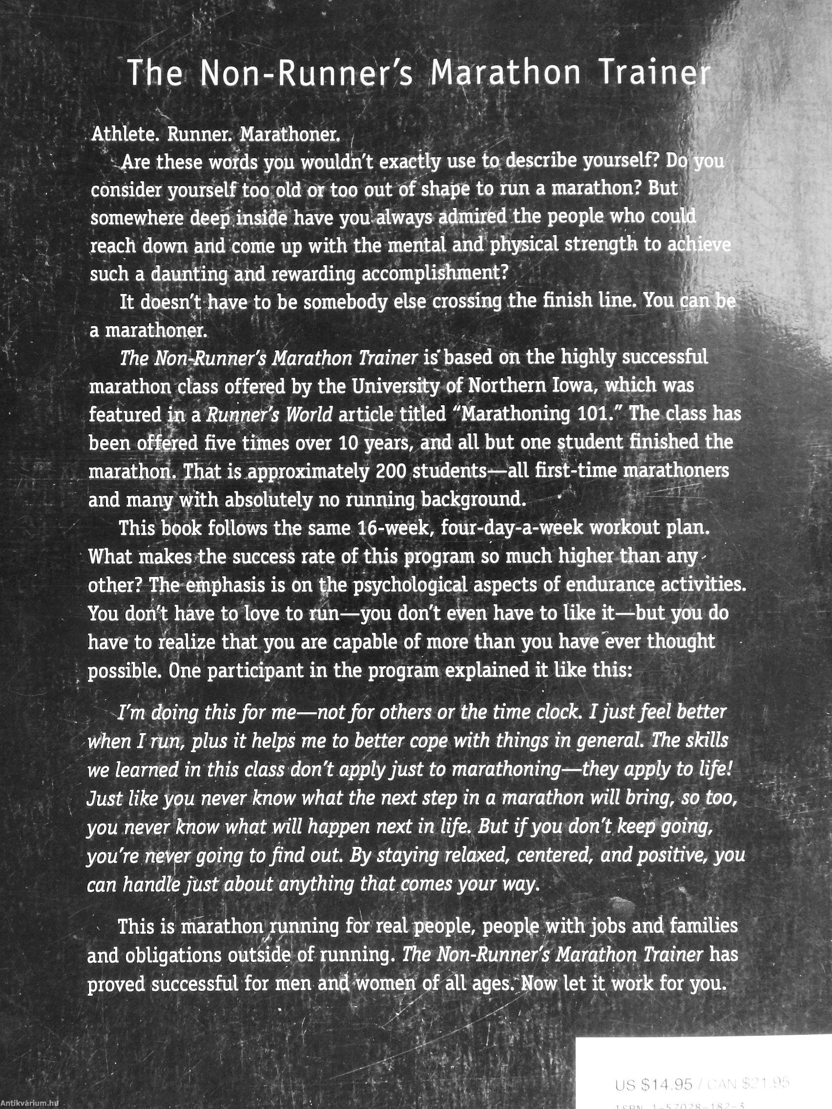 This book follows the same 16-week, four-day-a-week workout plan. What makes the success rate of this program so much higher than any-other? TJie emphasis is on ^e psychological aspects of endurance activities. You don't have to love to iun—you don't eVen have to like it—but you do have to resize that you are capable of more than you have ever thought , possible. One participant in the program explained it like this: