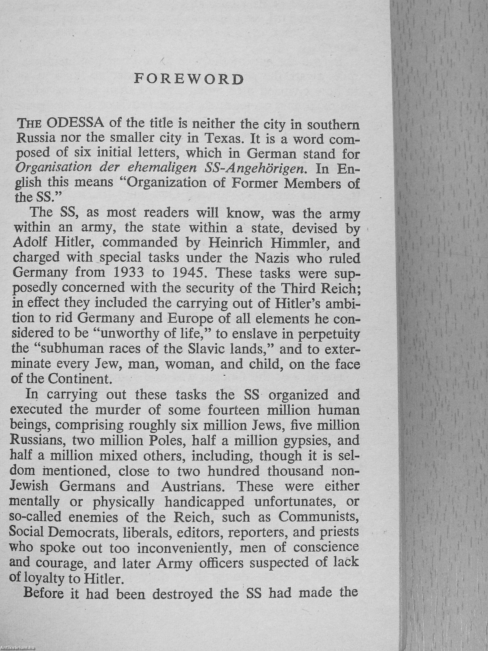 Code name: Werwolf. Setting: The New Germany. The action begins with the suicide of an elderly German Jew and explodes in revelation after revelation of a Mafia-like organization — O.D.E.S.S.A. - formed to protect and reestablish the pov er of SS mass murderers throughout the world of a real-l fe fugitive known as the "Butcher of I^iga" of a young Gern m journalist turned obsessed avenger of a brilliant, dement'^d plot to carry out Hitler's "Final Solution" twenty years affer the Führer's death! "Framed by the unshakable facts of two turbulent decades, filled with an exceptional cast of charact ^rs —both real and fictional—T^e Odessa File is a story of superior swift suspense An unmatchable reading experience!"
