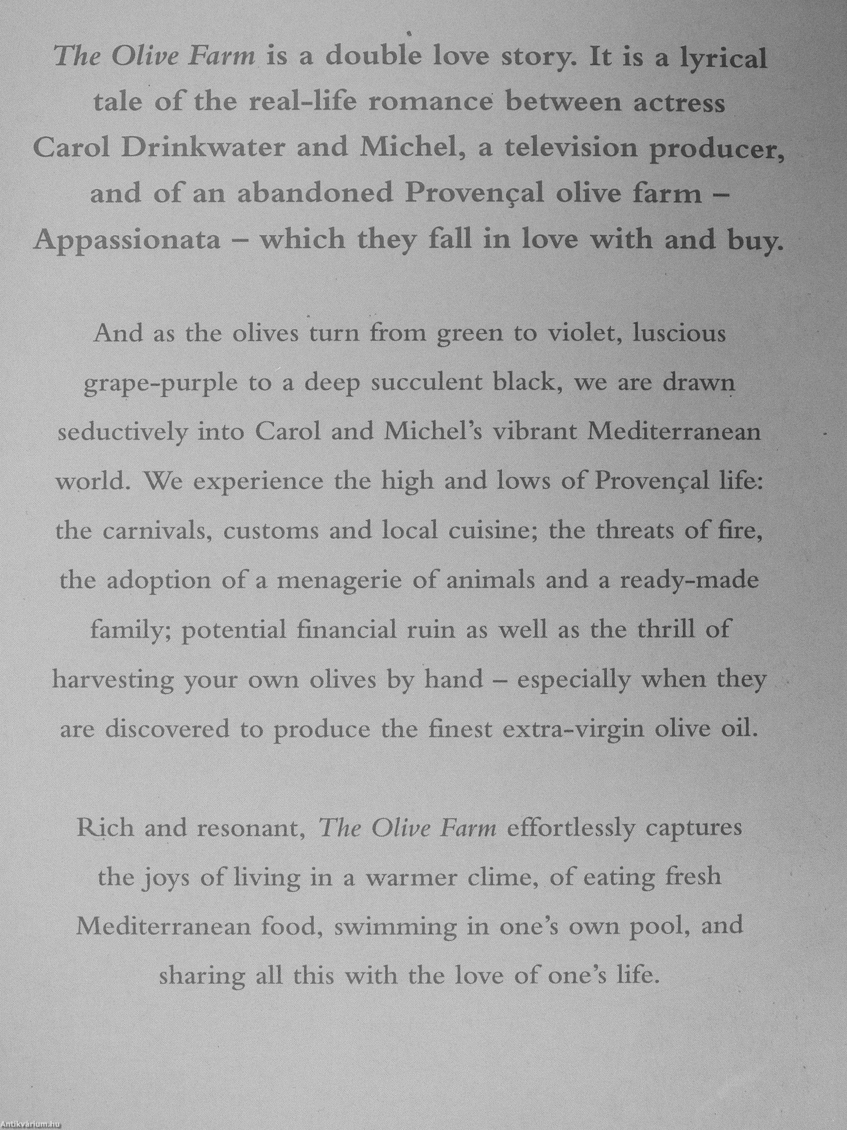 And as the olives turn from green to violet, luscious grape-purple to a deep succulent black, we are drawn seductively into Carol and Michel's vibrant Mediterranean world. We experience the high and lows of Provençal life: the carnivals, customs and local cuisine; the threats of fire, the adoption of a menagerie of animals and a ready-made
