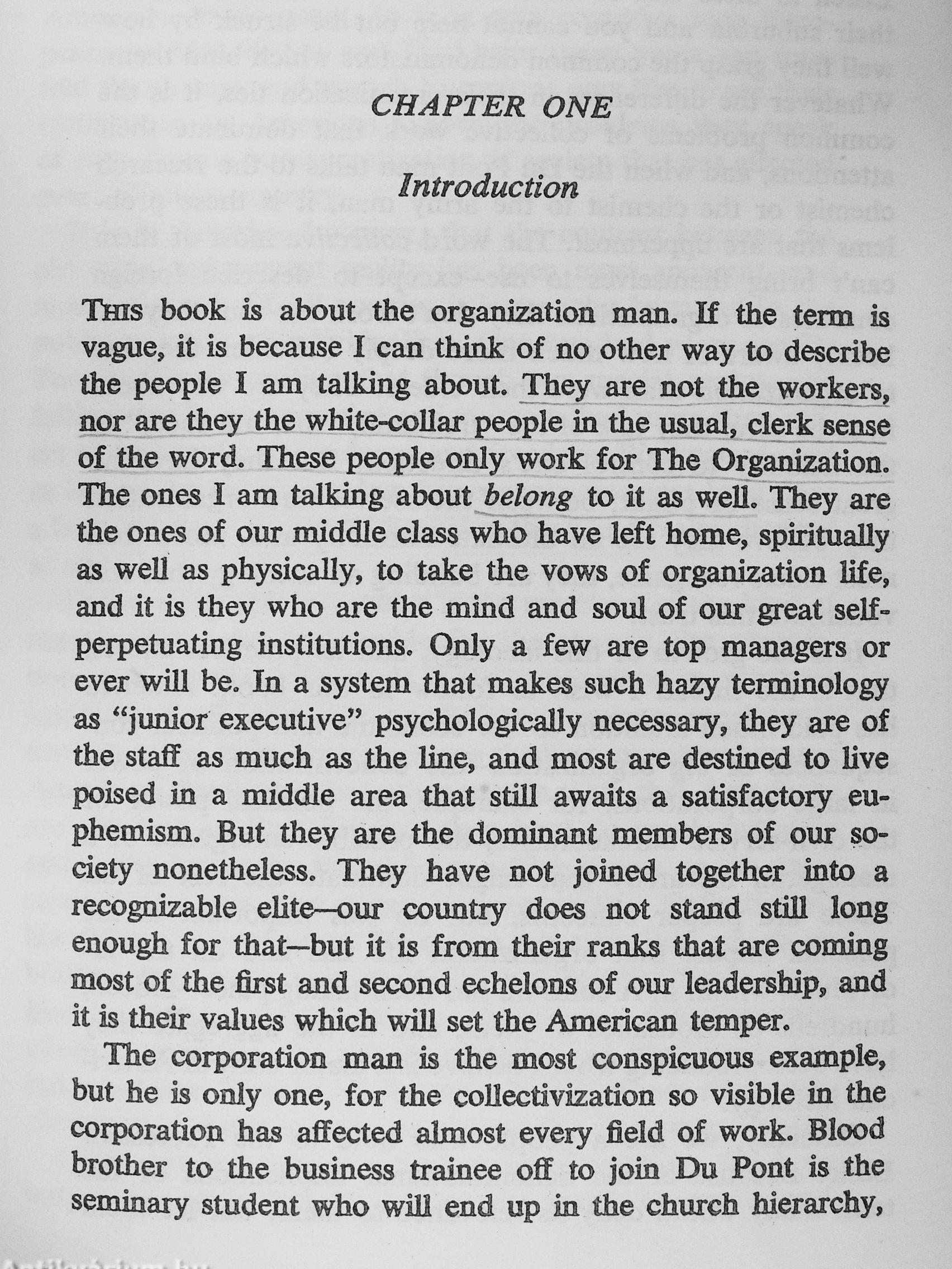 ¦ more are likely to lead. It is life under the protection of the big organization—the corporation, the government, perhaps the university, charitable organization, or labor union. Here modem Americans find the jobs that promise security and a high standard of living, and, Mr. Whyte believes, give up the