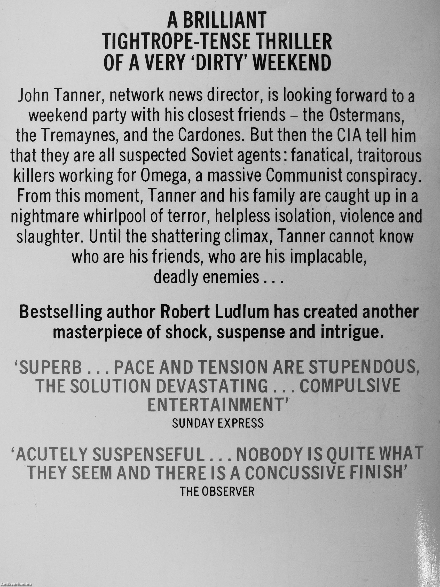 weekend party with his closest friends - the Ostermans, the Tremaynes, and the Cardones. But then the CIA tell him that they are all suspected Soviet agents: fanatical, traitorous killers working for Omega, a massive Communist conspiracy. From this moment. Tanner and his family are caught up in a nightmare whirlpool of terror, helpless isolation, violence and slaughter. Until the shattering climax. Tanner cannot know who are his friends, who are his implacable, deadly enemies