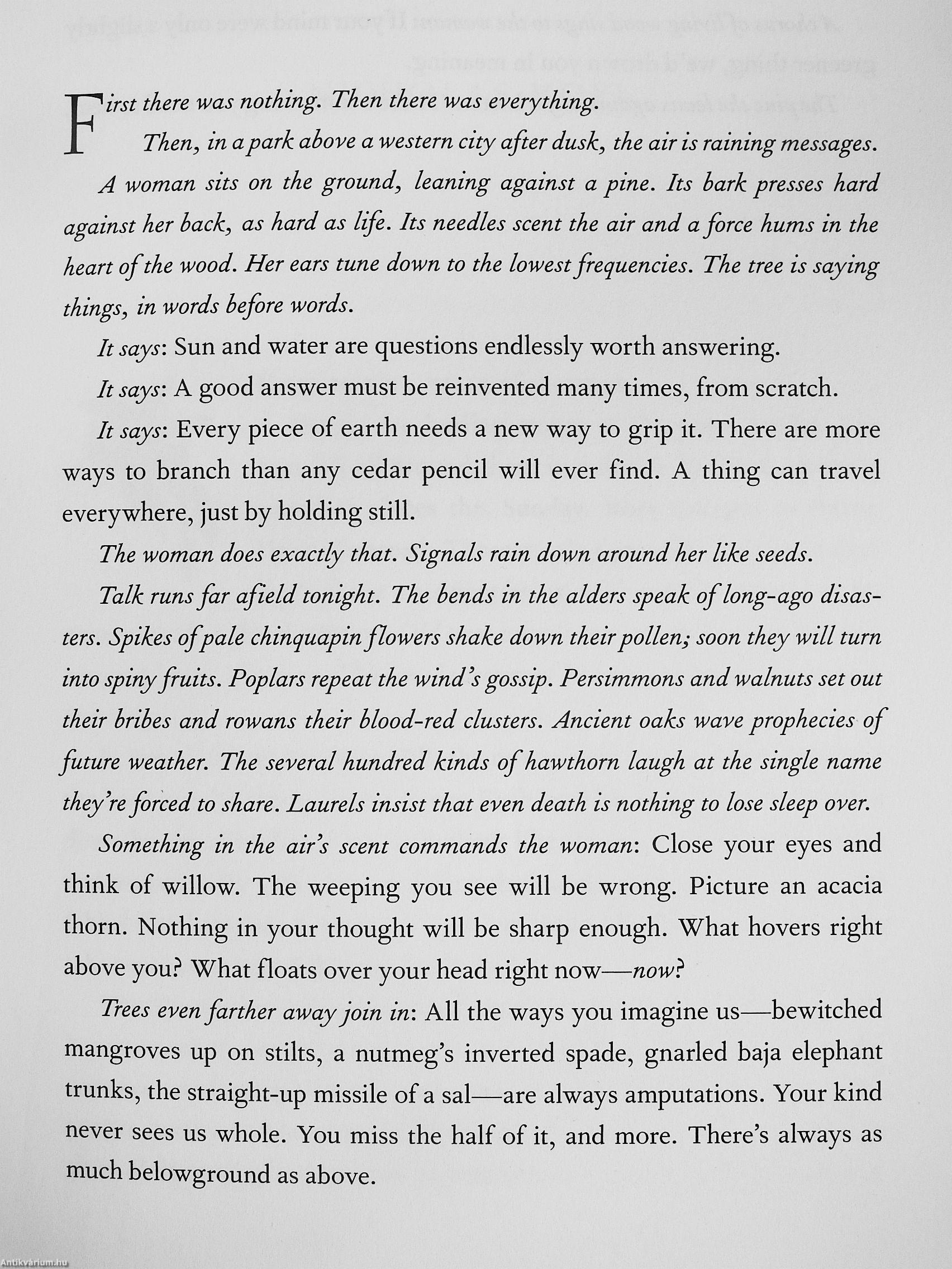 American chestnut. A hard-partying undergraduate in the late 1980s electrocutes herself, dies, and is sent back into life by creatures of air and light. A hearing- and speech-impaired scientist discovers that trees are communicating with one another. These and five other strangers, each summoned in different ways by trees, are brought together in a last stand to save the continent's few remaining acres of virgin forest.
