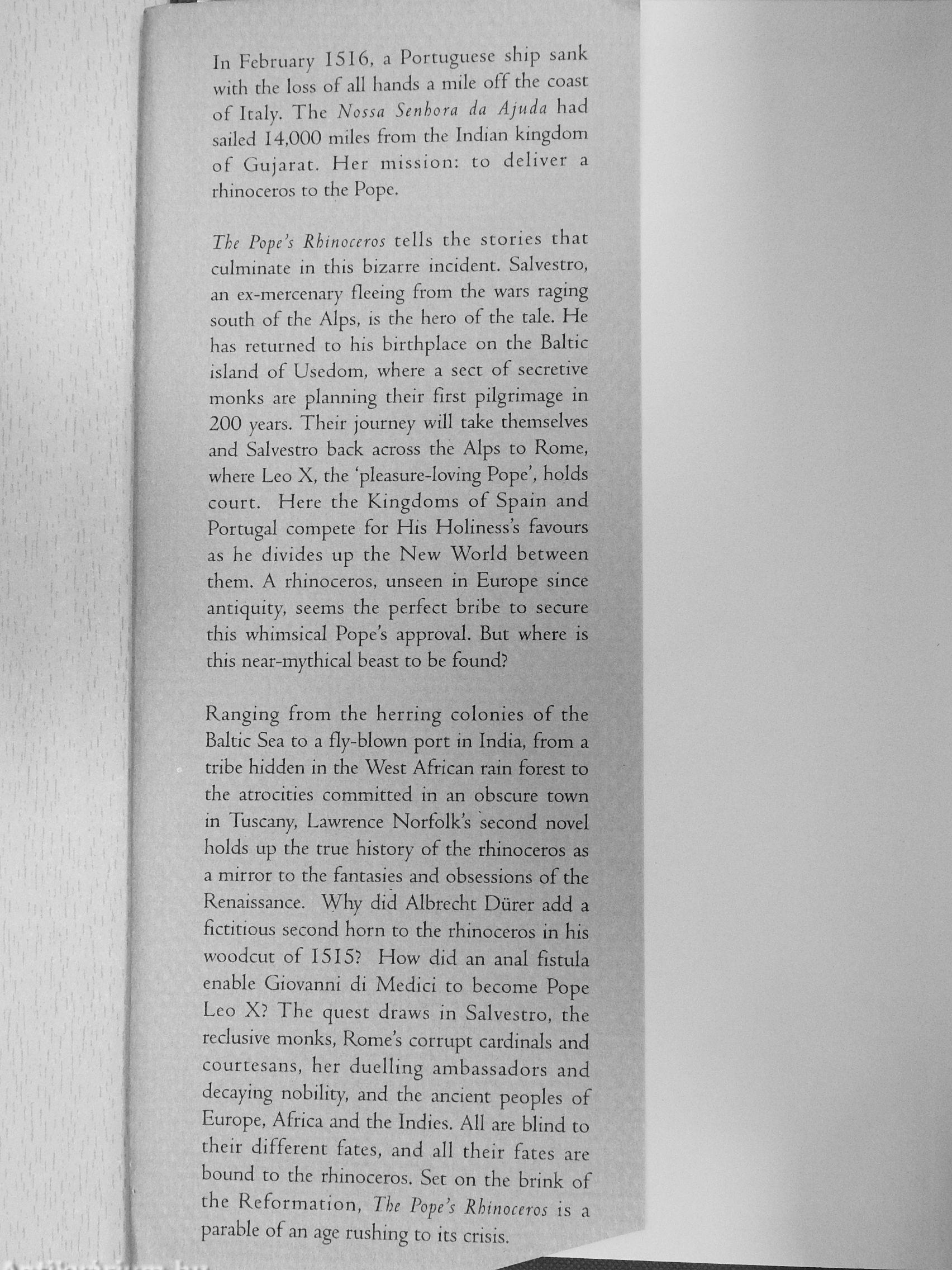 Ranging from the herring colonies of the Baltic Sea to a fly-blown port in India, from a tribe hidden in the West African rain forest to the atrocities committed in an obscure town in Tuscany, Lawrence Norfolk's second novel holds up the true history of the rhinoceros as a mirror to the fantasies and obsessions of the Renaissance. Why did Albrecht Dürer add a fictitious second horn to the rhinoceros in his woodcut of I5I5? How did an anal fistula enable Giovanni di Medici to become Pope Leo X? The quest draws in Salvestro, the reclusive monks, Rome's corrupt cardinals and courtesans, her duelling ambassadors and decaying nobility, and the ancient peoples of Europe, Africa and the Indies. All are blind to their different fates, and all their fates are bound to the rhinoceros. Set on the brink of the Reformation, The Pope's Rhinoceros is a parable of an age rushing to its crisis.