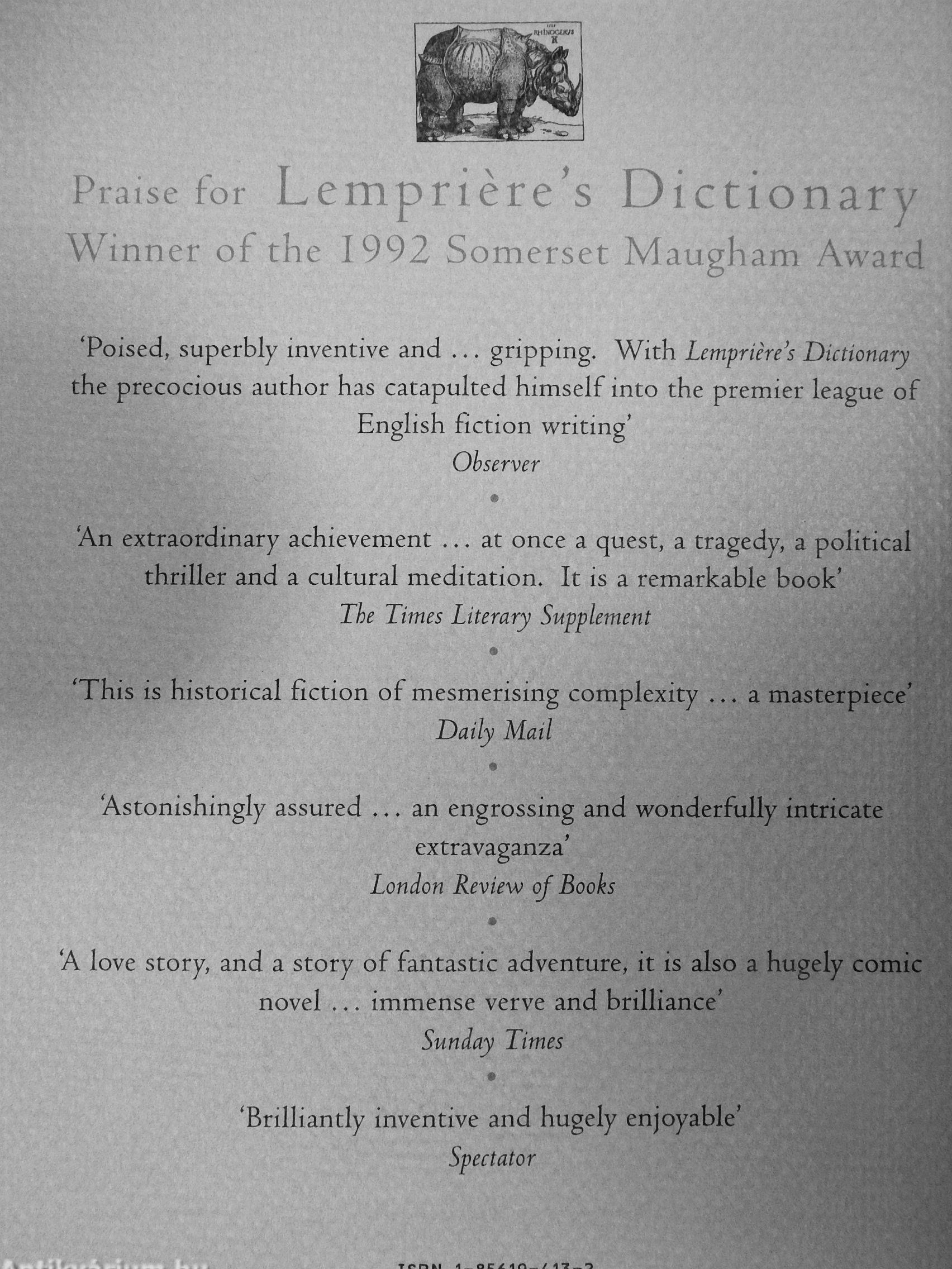 'Poised, superbly inventive and gripping. With Lempriere's Dictionary the precocious author has catapulted himself into the premier league of English fiction writmg' Observer