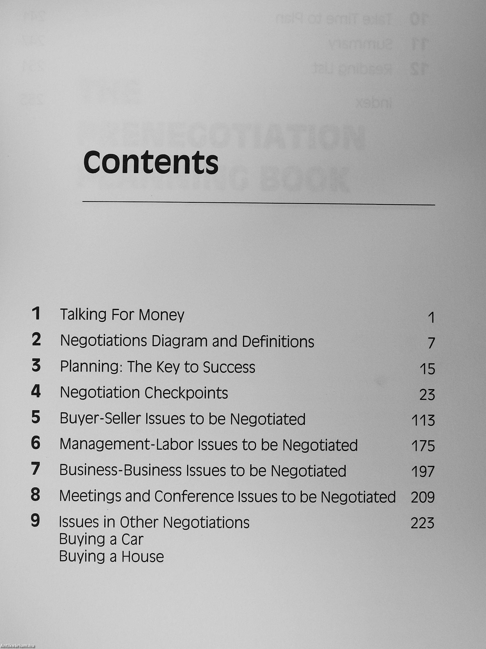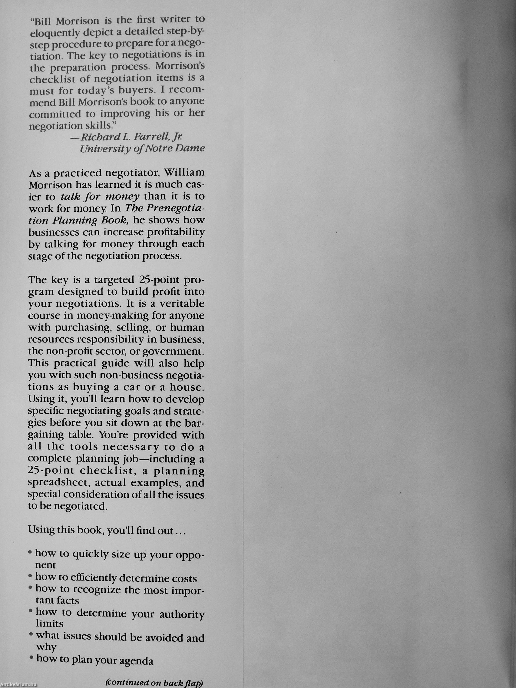 As a practiced negotiator, William Morrison has learned it is much easier to talk for money than it is to work for money In The Prenegotia-tion Planning Book, he shows how businesses can increase profitability by talking for money through each stage of the negotiation process.