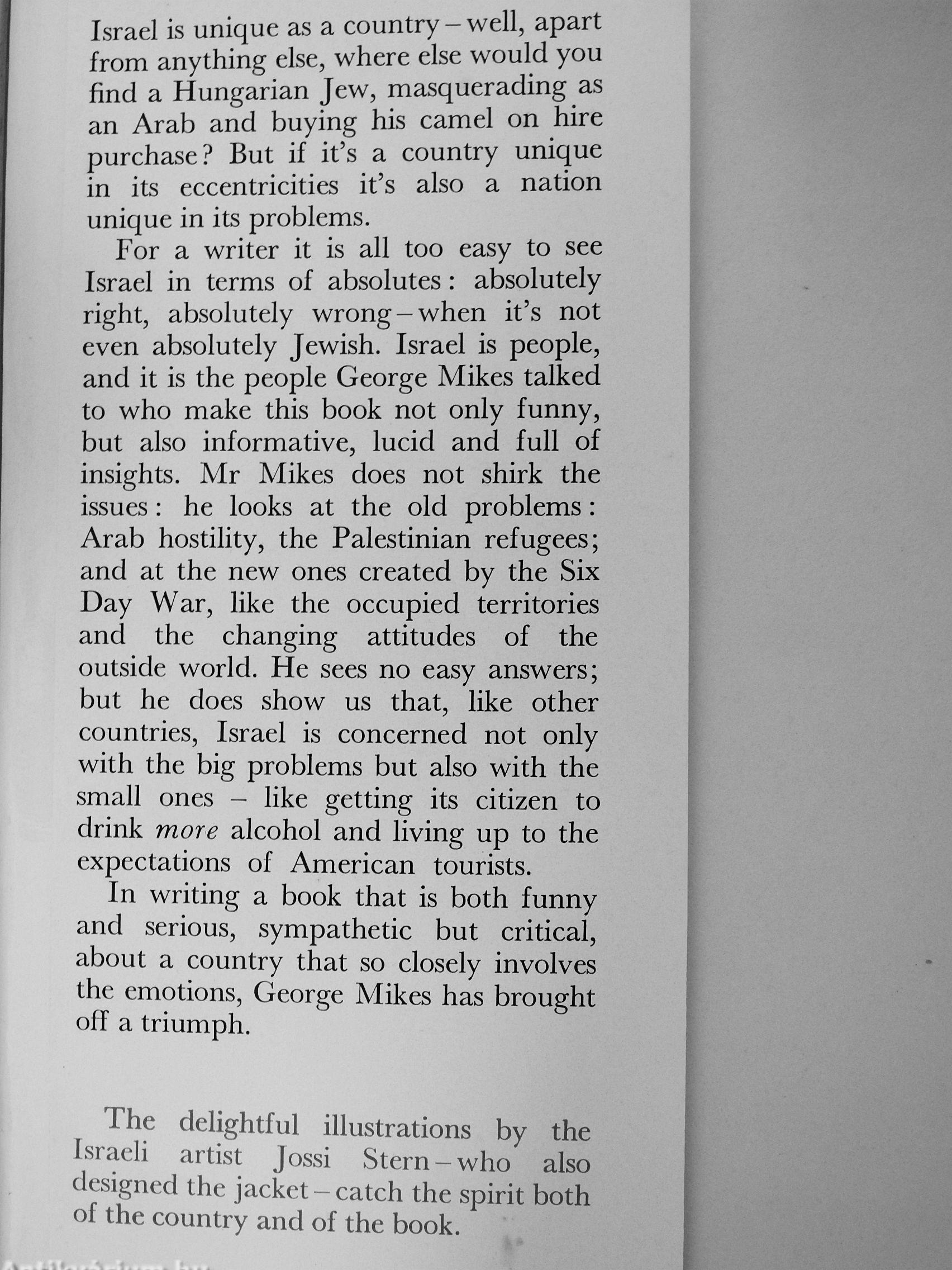 For a writer it is all too easy to see Israel in terms of absolutes : absolutely right, absolutely wrong —when it's not even absolutely Jewish. Israel is people, and it is the people George Mikes talked to who make this book not only funny, but also informative, lucid and full of insights. Mr Mikes does not shirk the issues : he looks at the old problems : Arab hostility, the Palestinian refugees; and at the new ones created by the Six Day War, like the occupied territories and the changing attitudes of the outside world. He sees no easy answers; but he does show us that, like other countries, Israel is concerned not only with the big problems but also with the small ones - like getting its citizen to drink more alcohol...