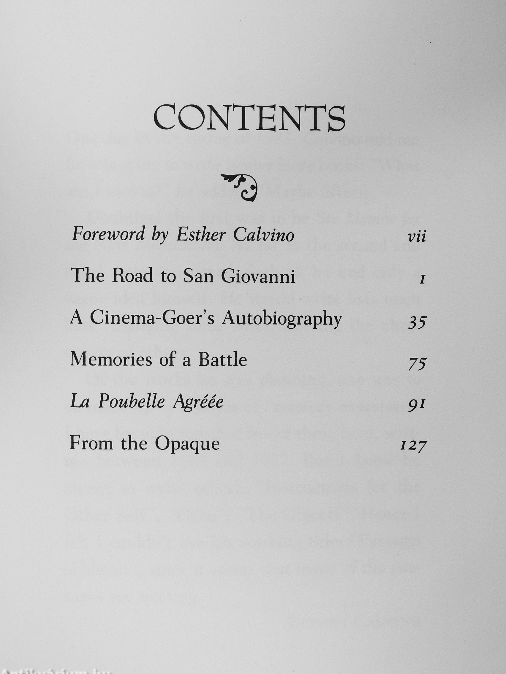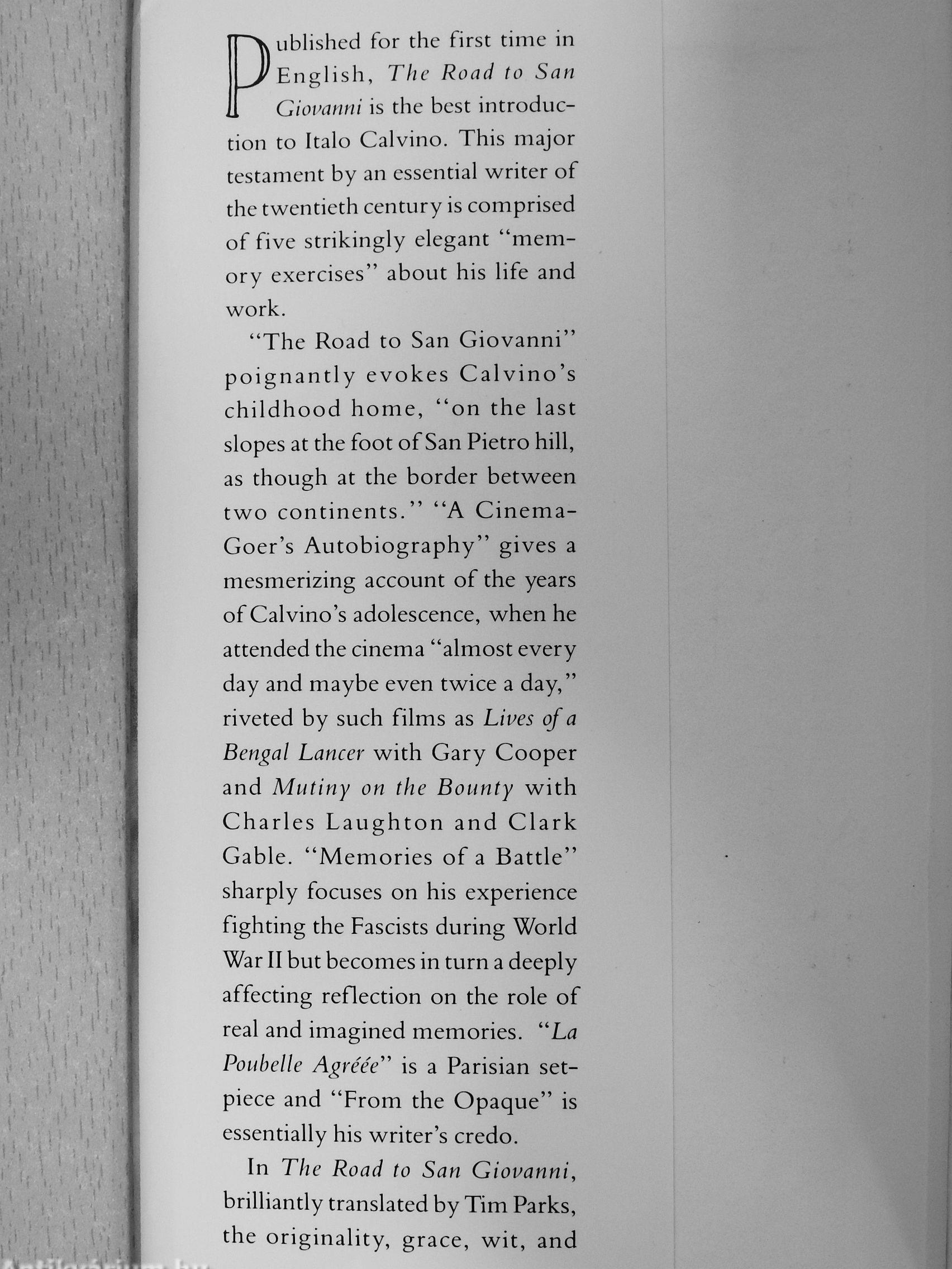 "The Road to San Giovanni" poignantly evokes Calvino's childhood home, "on the last slopes at the foot of San Pietro hill, as though at the border between two continents." "A Cinema-Goer's Autobiography" gives a mesmerizing account of the years of Calvino's adolescence, when he attended the cinema "almost every day and maybe even twice a day," riveted by such films as Lives of a Bengal Lancer with Gary Cooper and Mutiny on the Bounty with Charles Laughton and Clark Gable. "Memories of a Battle" sharply focuses on his experience fighting the Fascists during World War II but becomes in turn a deeply affecting reflection on the role of real and imagined memories. "La Poubelle Agre'eV is a Parisian set-piece and "From the Opaque" is essentially his writer's credo.