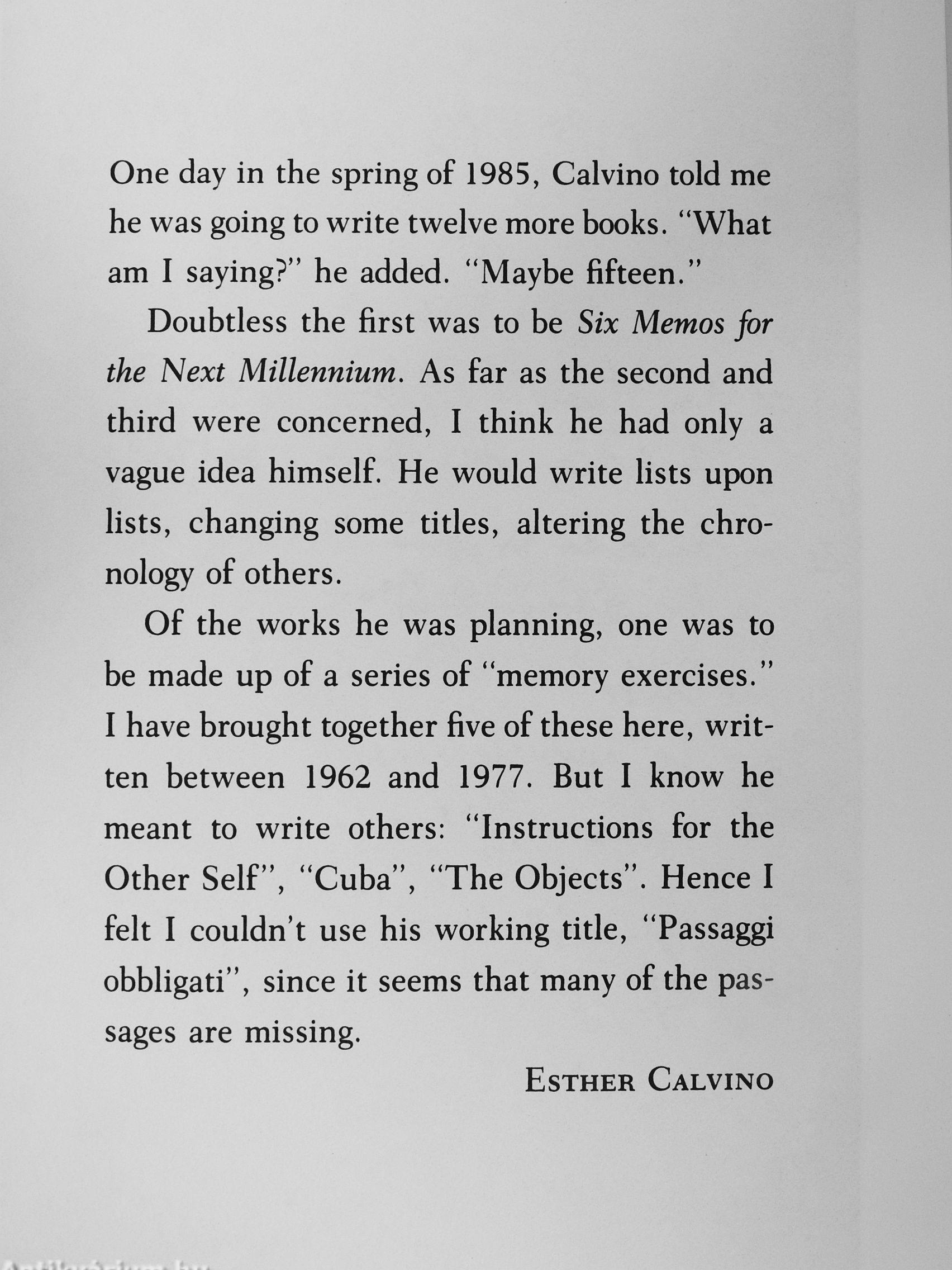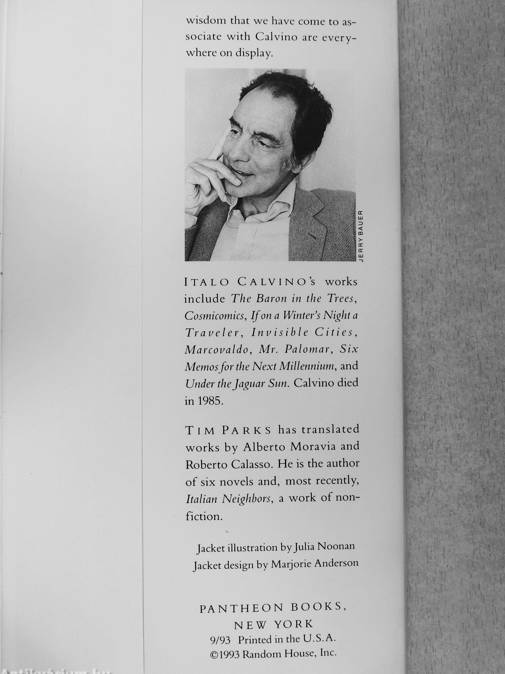 italo Calvin o's works include The Baron in the Trees, Cosmicornics, If on a Winter's Night a Traveler, Invisible Cities, Marcovaldo, Mr. Palomar, Six Memosfor the Next Millenninm, and Under the Jaguar Sun. Calvino died in 1985.