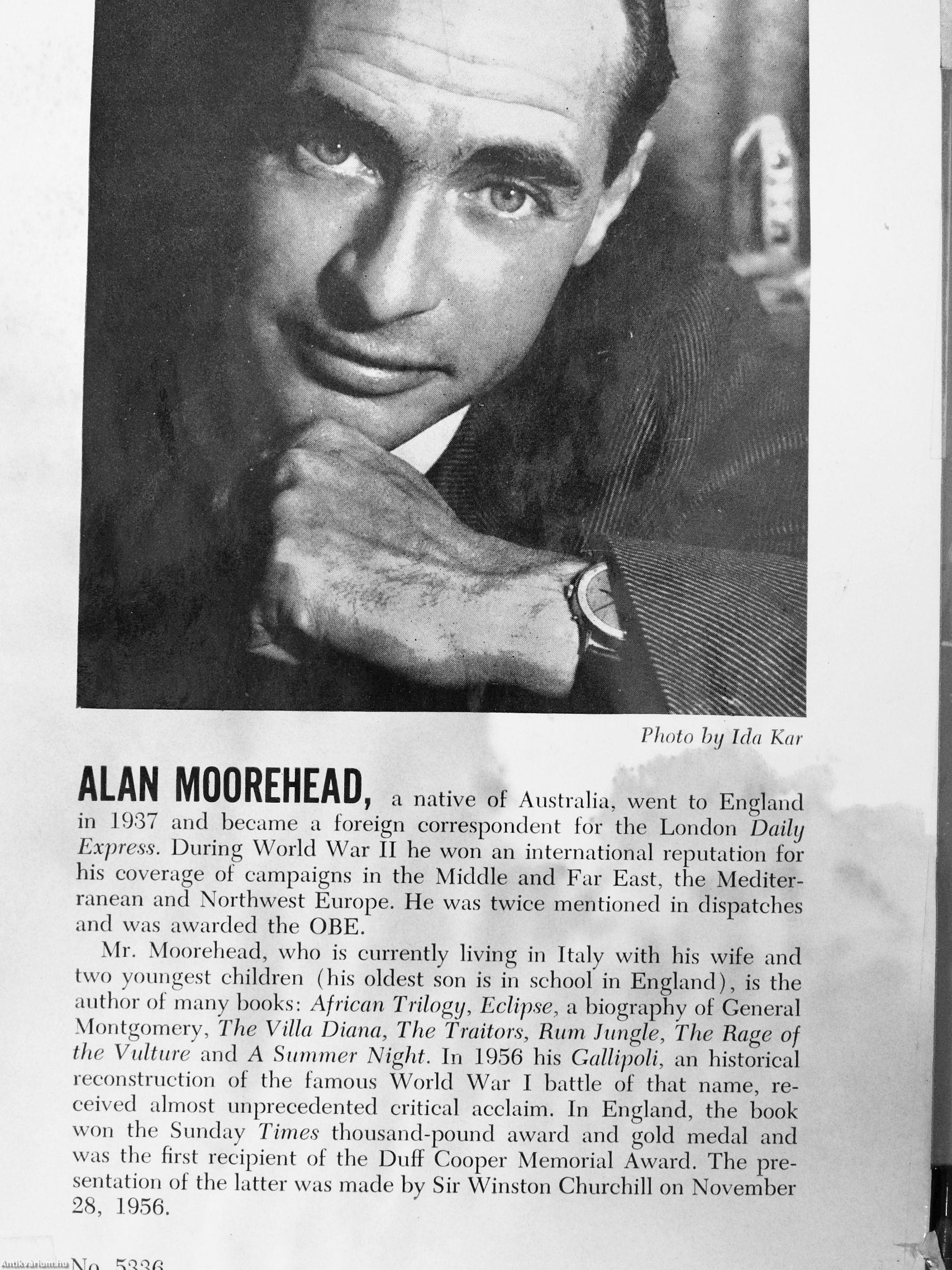 Mr. Moorehead, who is currently living in Italy with his wife and two youngest children (his oldest son is in school in England), is tlie author of many books: African Trilogij, Eclipse, a biography of General Montgomery, Tlic Villa Diana, The Traitors, Rum Jtingle, The Rage of the Vulture and A Summer Night. In 1956 his Gallipoli, an historical reeonstruction of the famous World War I battle of that name, received almost unprecedented critical acclaim. In England, the book-won tlie .Sunday Times thousand-pound award and gold medal and was the first recipient of the Duff Cooper Memorial Award. The pre-sentat^on of the latter...