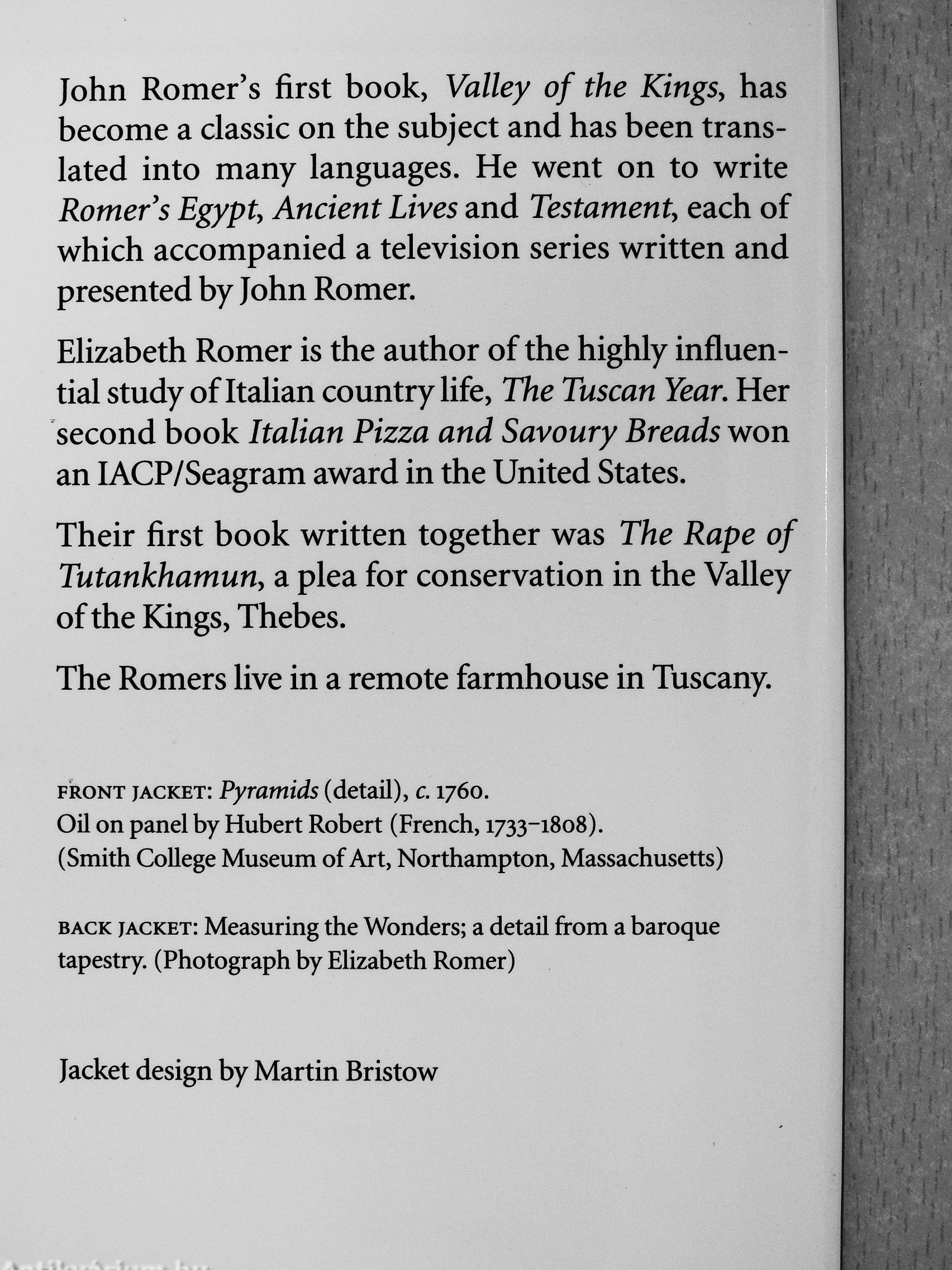John Romer's first book, Valley of the Kings, has become a classic on the subject and has been translated into many languages. He went on to write Romer's Egypt, Ancient Lives and Testament, each of which accompanied a television series written and presented by John Romer.