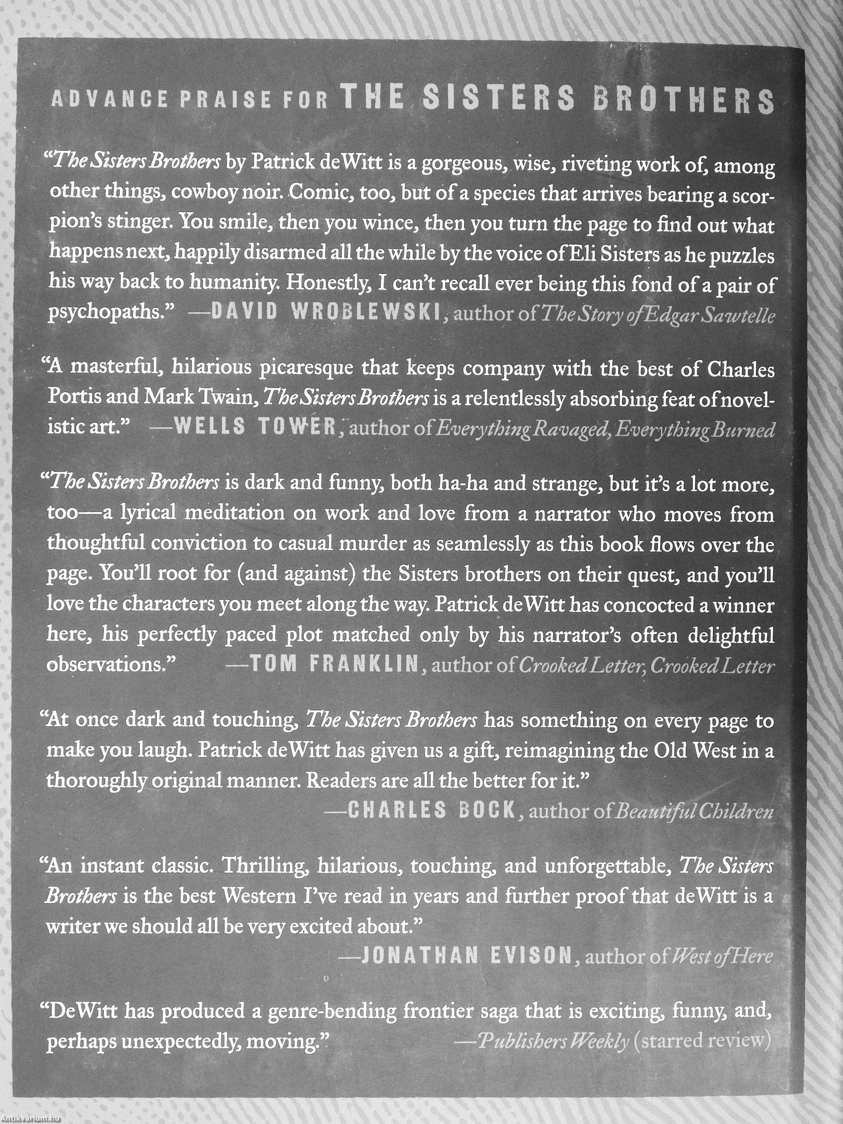 "At once dark and touching, TheSistersBrotbers has something on every page to make you laugh. Patrick deWitt has given us a gift, reimagining the Old West in a thoroughly original manner. Readers are aU the better for it."