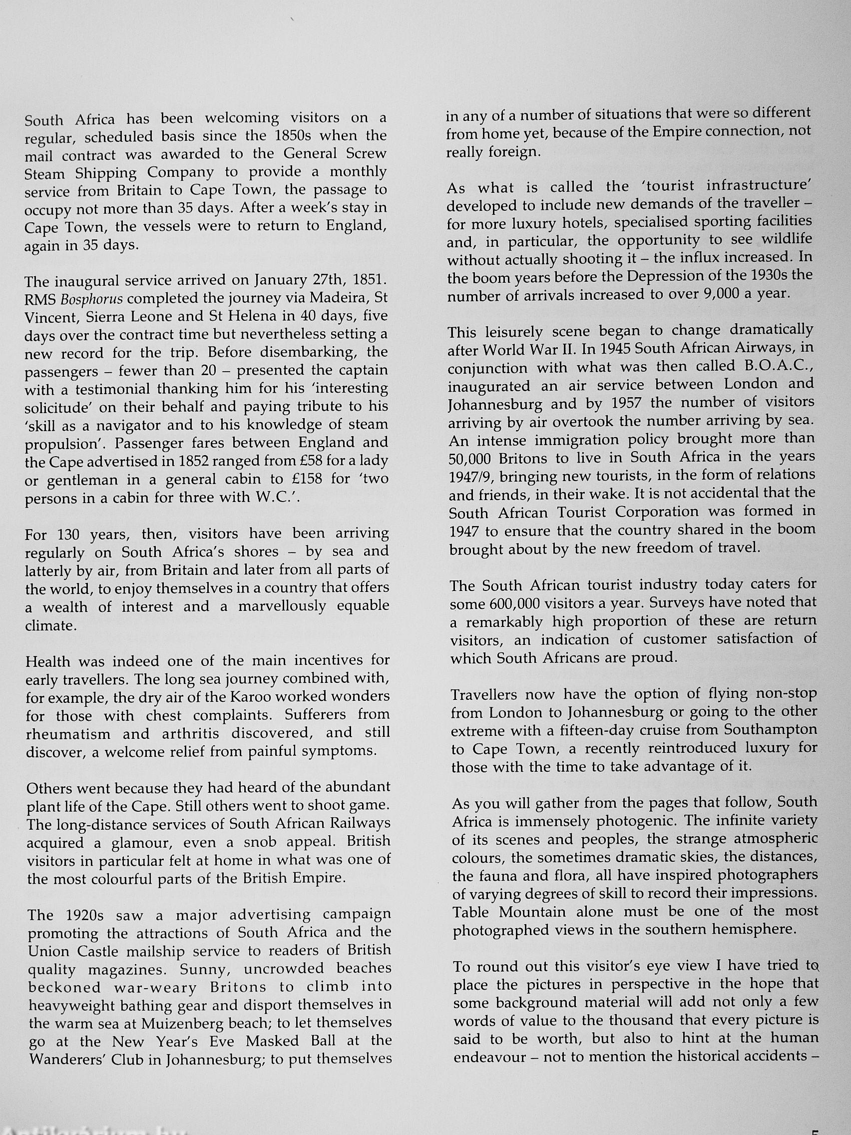 The South African tovirist industry now caters for some 600,000 visitors a year, and surveys have shown that a remarkably high proportion are return visitors? an indication of customer satisfaction of which South Africans are justifiably proud.