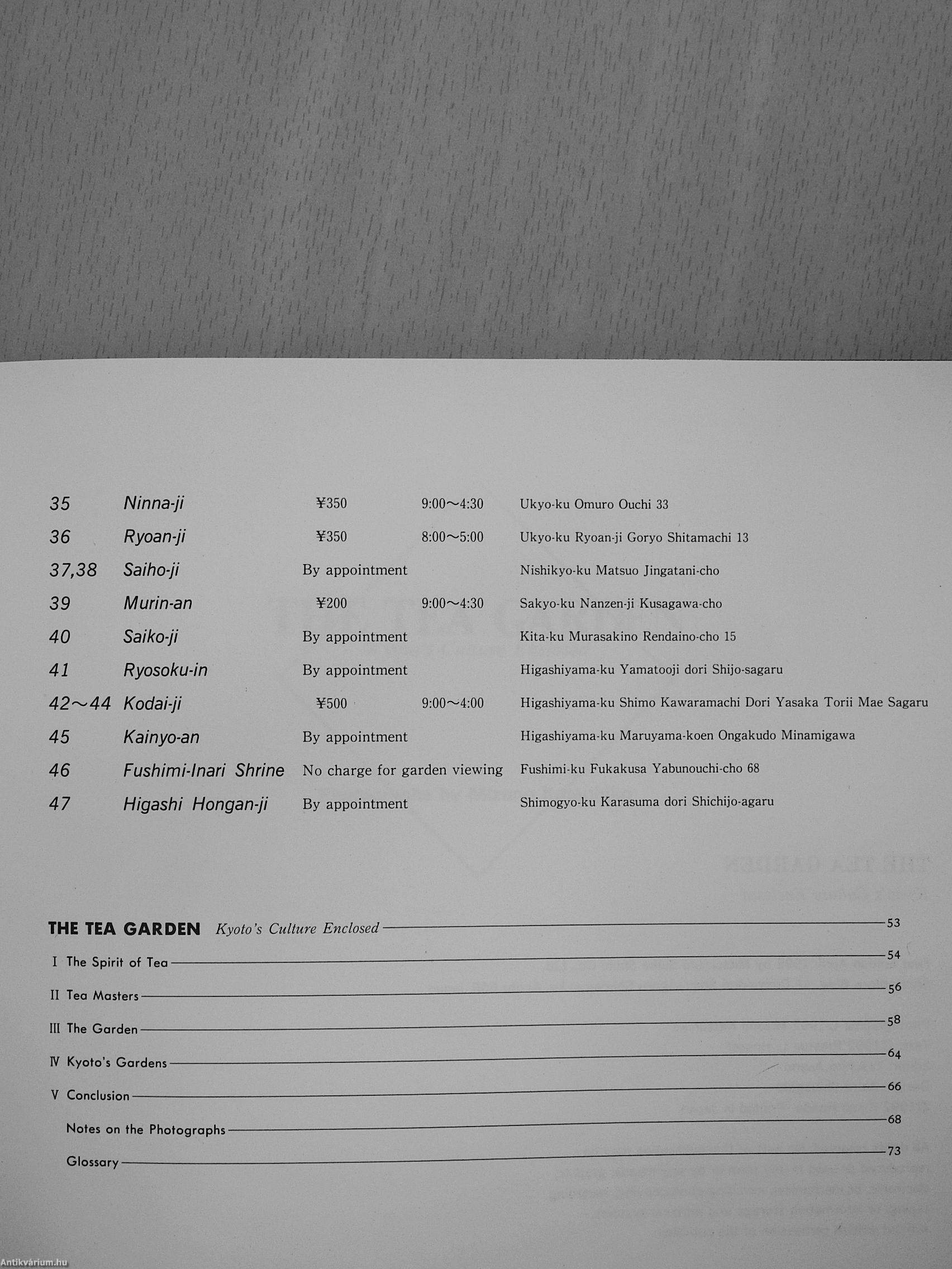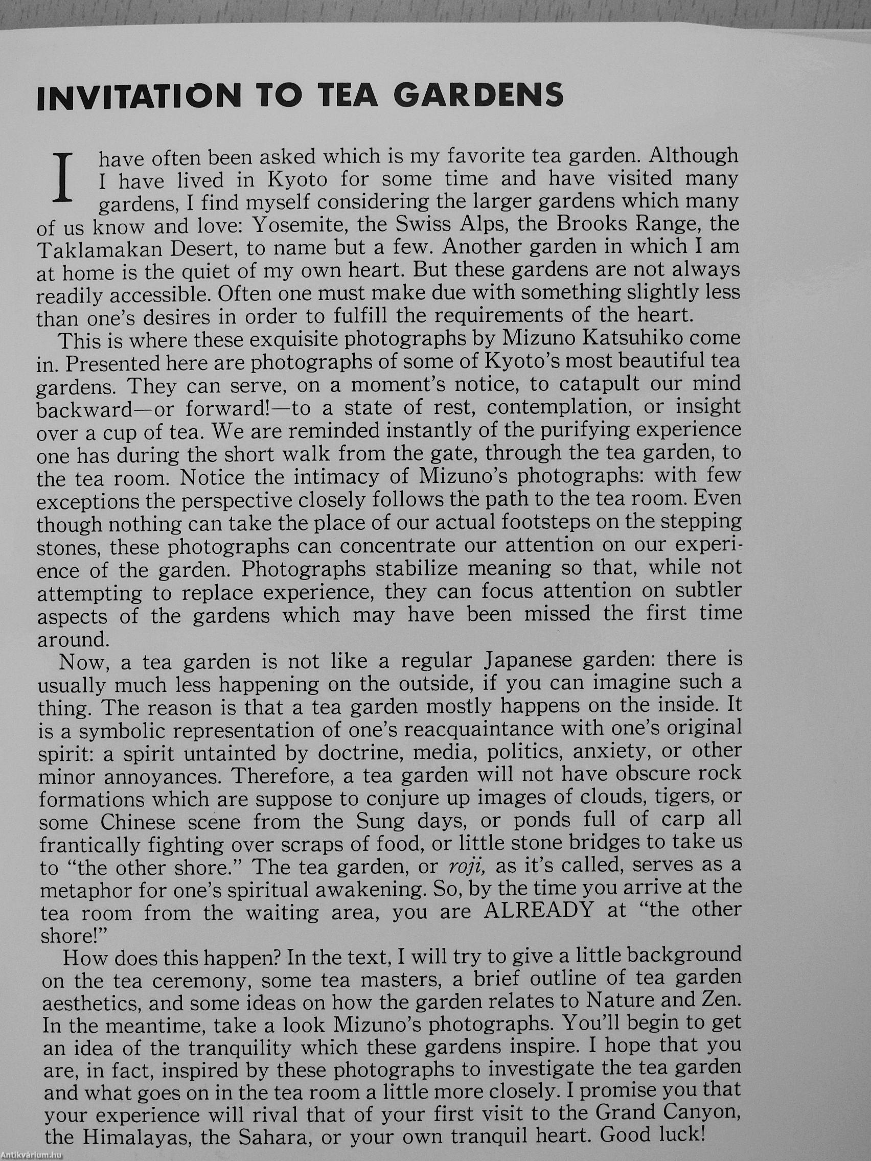 This is where these exquisite photographs by Mizuno Katsuhiko come in. Presented here are photographs of some of Kyoto's most beautiful tea gardens. They can serve, on a moment's notice, to catapult our mind backward—or forward!—to a state of rest, contemplation, or insight over a cup of tea. We are reminded instantly of the purifying experience one has during the short walk from the gate, through the tea garden, to the tea room. Notice the intimacy of Mizuno's photographs: with few exceptions the perspective closely follows the path to the tea room. Even though nothing can take the place of our actual footsteps on the stepping stones, these photographs can concentrate our attention on our experience of the garden. Photographs stabilize meaning so that, while not attempting to replace experience, they can focus attention on subtler aspects of the gardens which may have been missed the first time around.