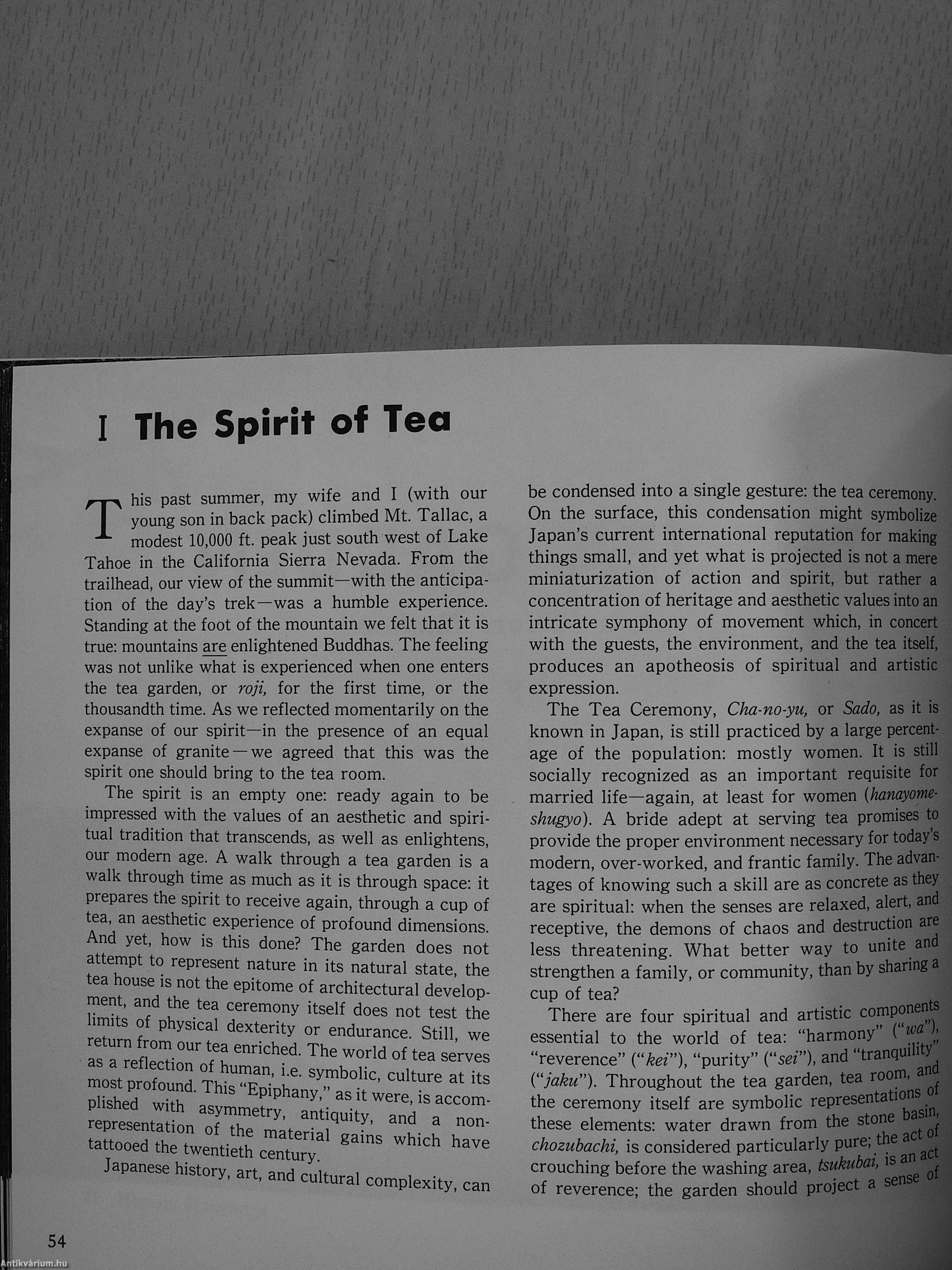 I have often been asked which is my favorite tea garden. Although 1 have lived in Kyoto for some time and have visited many gardens, I find myself considering the larger gardens which many of us know and love: Yosemite, the Swiss Alps, the Brooks Range, the Taklamakan Desert, to name but a few. Another garden in which I am at home is the quiet of my own heart. But these gardens are not always readily accessible. Often one must make due with something slightly less than one's desires in order to fulfill the requirements of the heart.