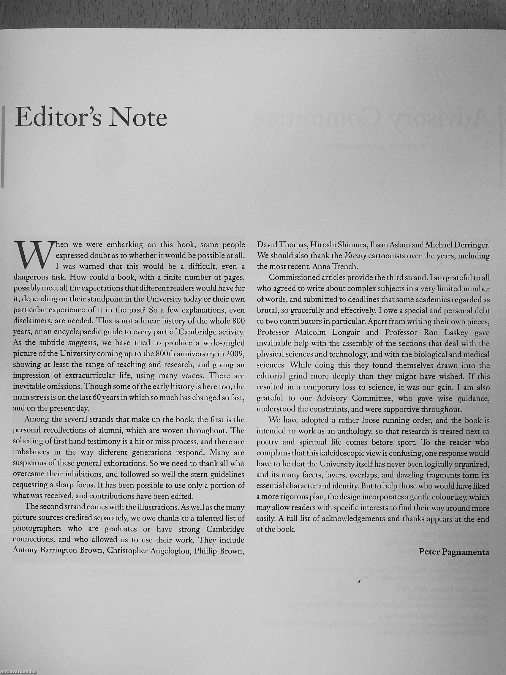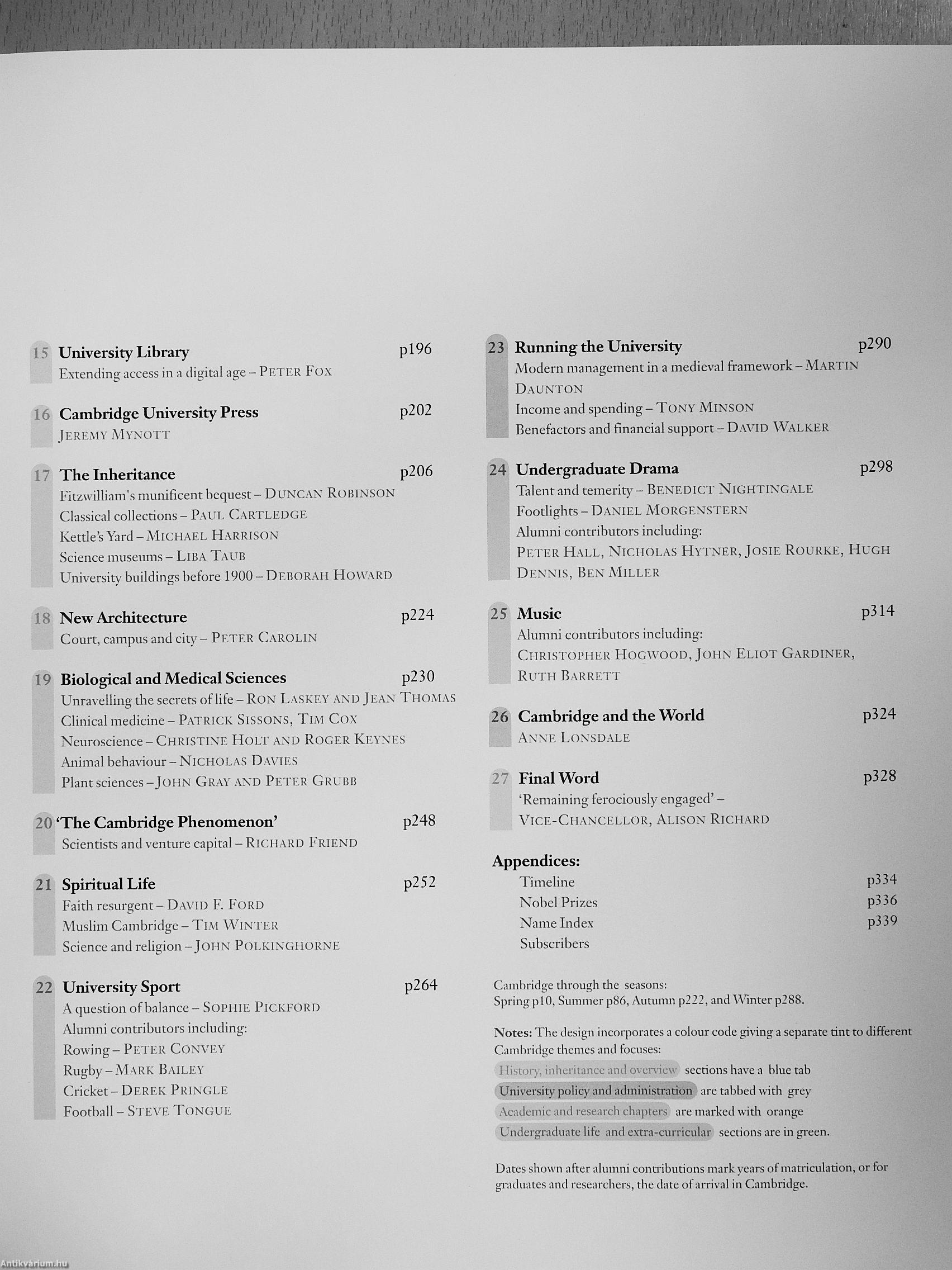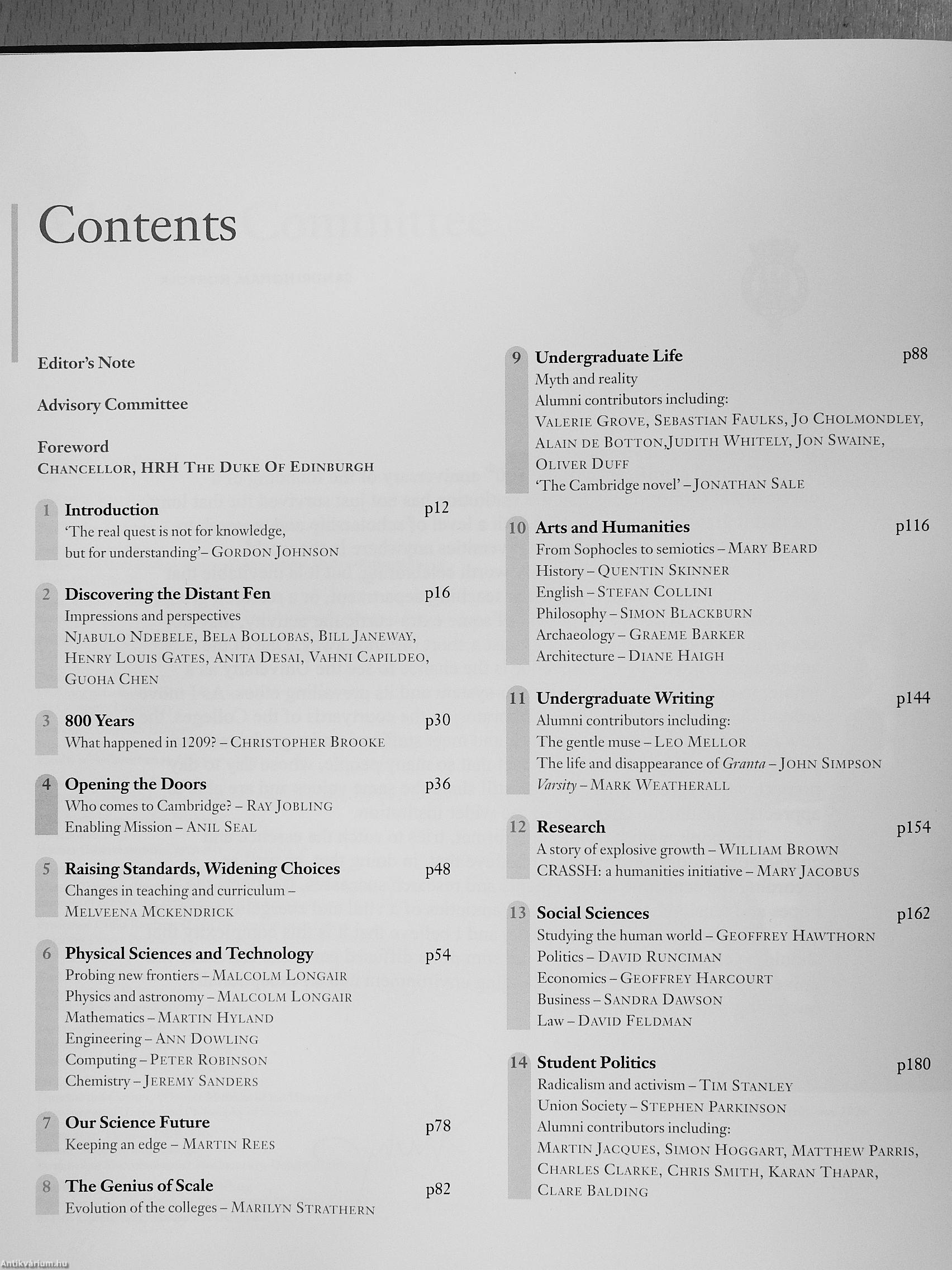 Academic contributors, drawn from among the sharpest minds in Cambridge today, review past achievements and look to the future in the sciences, arts and humanities. The beauty of the University's setting and collegiate buildings, its heritage of art and cultural treasures, and its spectacular new architecture, are interpreted by experts. The book deals with changes in admissions, management, and finance. And threaded throughout are the first-hand memories of alumni and alumnae, the criteria for selection being not their subsequent fame or fortune, but the sharpness and relevance of recollections. Even so, among the hundreds of contributors there are some familiar names. They include Sebastian Faulks, Alain de Botton, A.S.Byatt, Anita Desai, John Simpson, Jeremy Paxman, Simon Hoggart, Peter Hall, Nicholas Hytner, John Shrapnel, Sue Perkins, Christopher Hogwood and John Eliot Gardiner, and many others.
