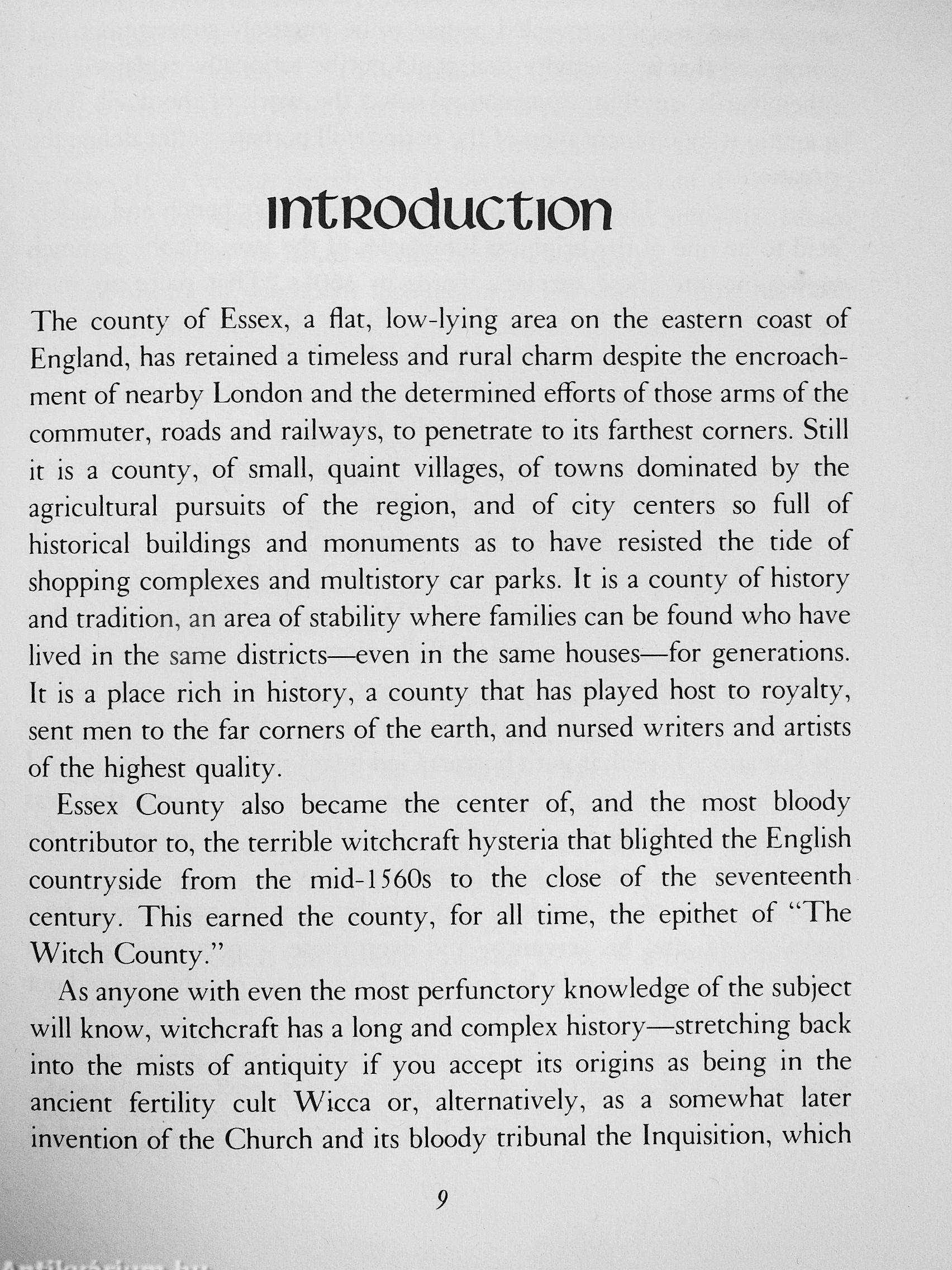Essex County was the center of the terrible witchcraft hysteria that blighted the English countryside from the mid-1560's to the close of the seventeenth century. This earned Essex, for all time, the epithet of "The Witch County."