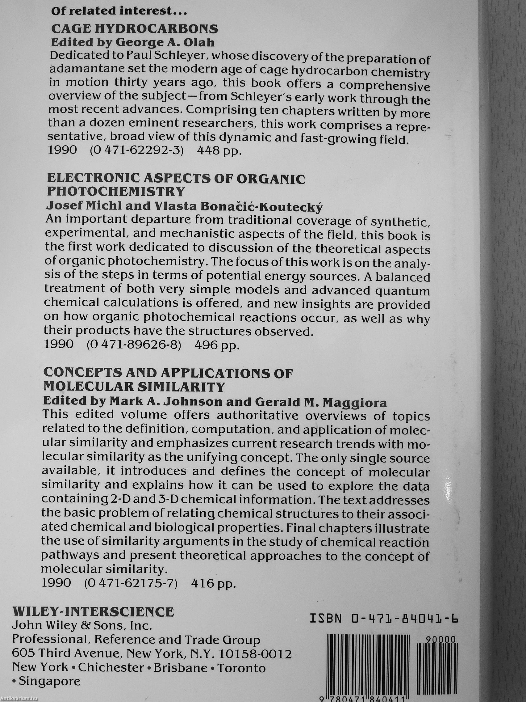Edited by Marit A. Johnson and Gerald N. Naggiora This edited volume offers authoritative overviews of topics related to the definition, computation, and application of molecular similarity and emphasizes current research trends with molecular similarity as the unifying concept. The only single source available, it introduces and defines the concept of molecular similarity and explains how it can be used to explore the data containing 2-D and 3-D chemical information. The text addresses the basic problem of relating chemical structures to their associated chemical and biological properties. Final chapters illustrate the use of similarity arguments in the study of chemical reaction pathways and present theoretical approaches to the concept of molecular similarity. 1990 (0 471-62175-7) 416 pp.