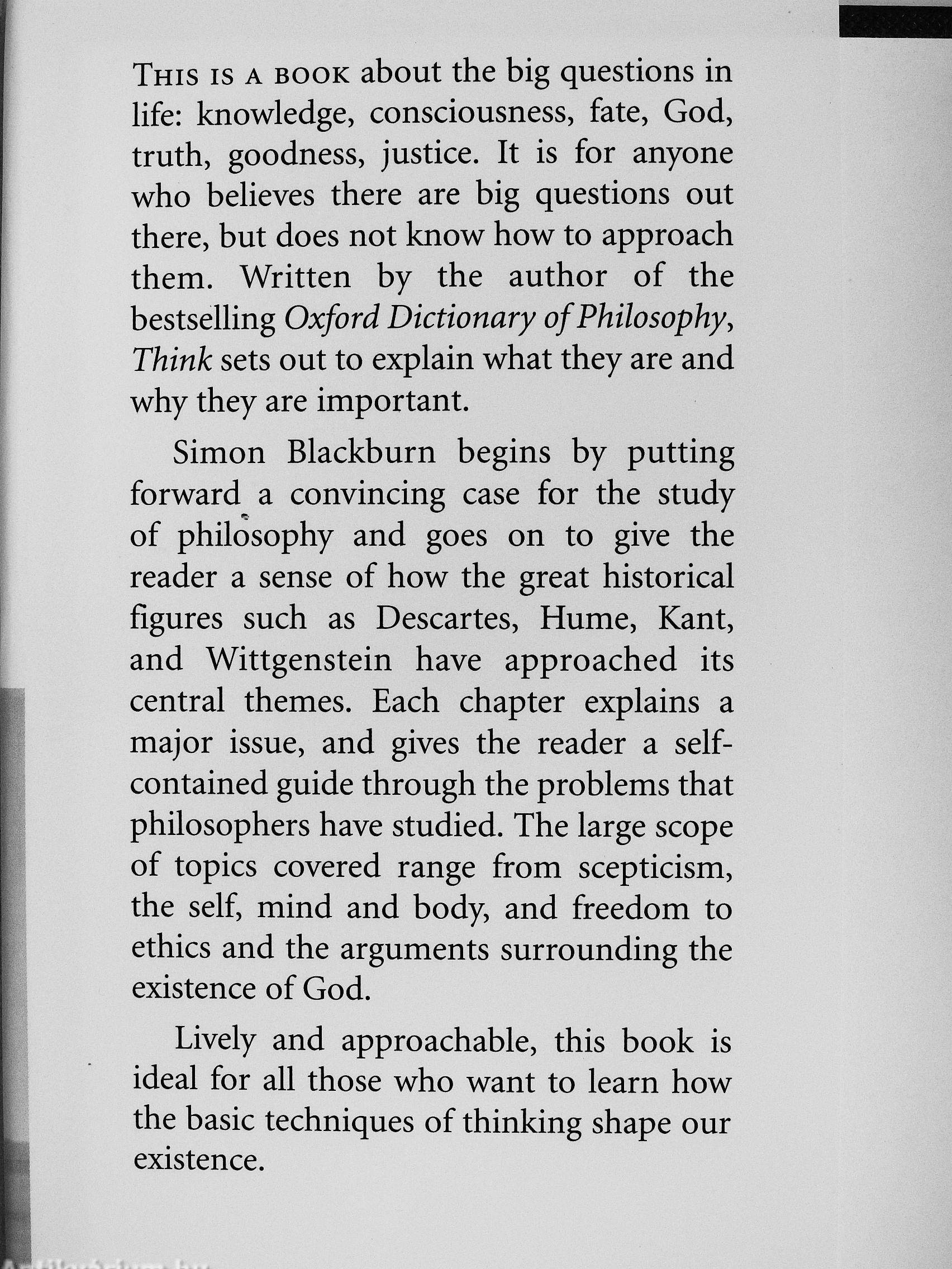 This is a book about the big questions in hfe: knowledge, consciousness, fate, God, truth, goodness, justice. It is for anyone who believes there are big questions out there, but does not know how to approach them. Written by the author of the bestselling Oxford Dictionary of Philosophy, Think sets out to explain what they are and why they are important.