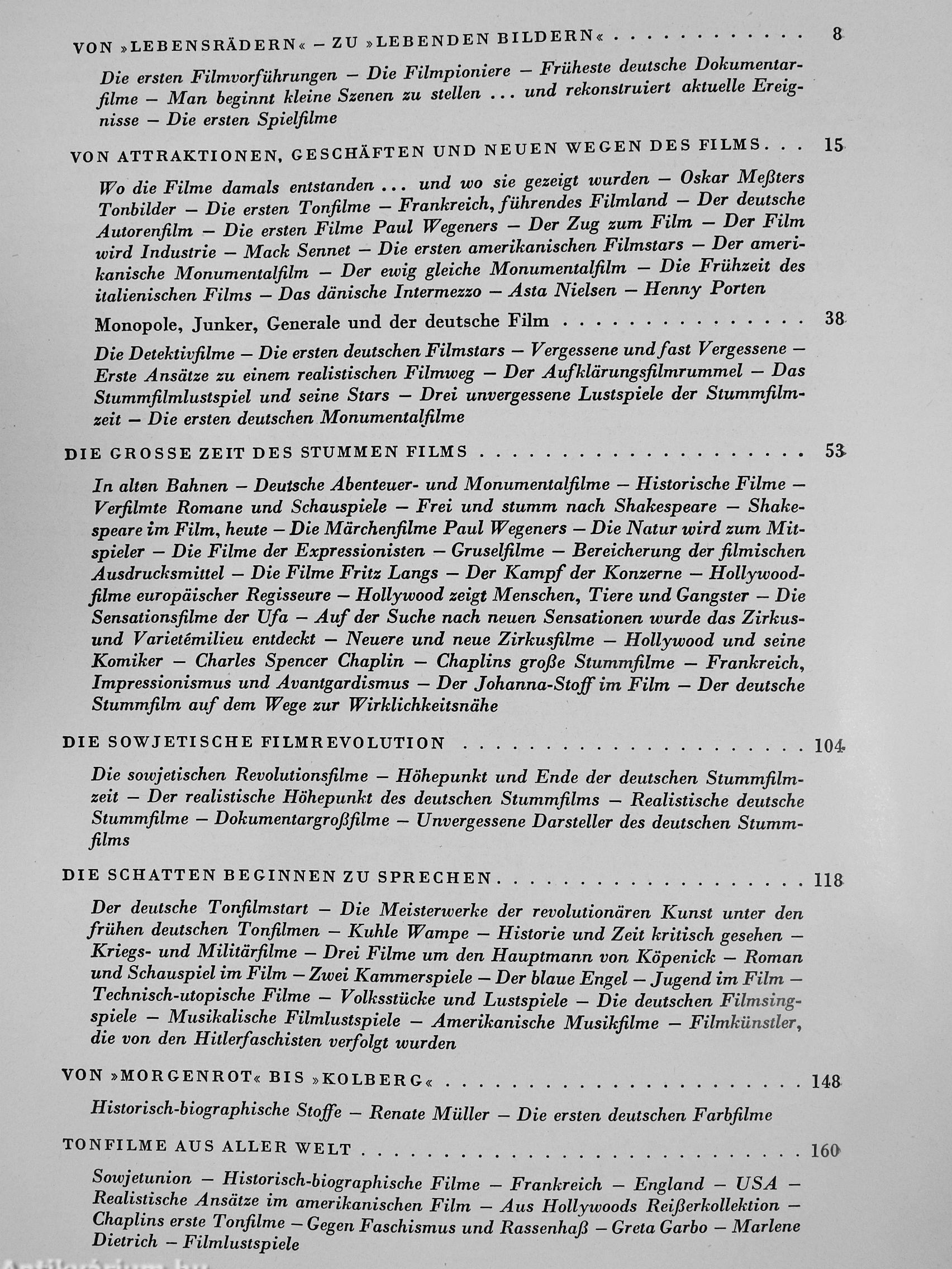Lebende Bild er wurden die ersten Filme einst von ihren Schöpfern genannt. Als Kunstwerke bezeichnen wir heute die besten der »bewegten Fotografien bewegten Geschehens«. Kunst oder billiges Massenvergnli-gen? Viele interessiert diese Frage. Wir glauben, der Film kann beides sein. Sehr groß ist die Zahl der Kinobesucher im Verhältnis zu denen, die aus innerem Bedürfnis in die Theater, Konzertsäle oder Kunstgalerien gehen. Millionen erleben im Kino erstmalig, was das bedeutet: Kunst — Gestaltung menschlicher Schicksale. Millionenvon Menschen, derenKunst-verständnis noch nicht geweckt war, wurden aber auch verbildet durch die Flut von Kitsch, Unmoral und Unmenschlichkeit, die sich über die weiße Leinwand ergoß. Ist es notwendig, daß man sich mit dem Weg des Films beschäftigt? Es ist notwendig. Und es sollte nicht nur von den »Berufenen«, den Wissenschaftlern und Künstlern getan werden. Es gibt kaum einen Menschen, der nicht ins Kino geht. Jeder sollte wissen wie der Film geworden ist. Ein kleiner Beitrag dazu soll dieses Buch sein. Erinnerungen an früher Erlebtes, rückblickende Sichtung einmal empfangener Eindrücke wollen wir dem Leser und Betrachter mit diesem »Bilderbuch« ermöglichen, bisher Unbekanntes nahebringen. Über 800 Bilder der bedeutendsten und charakteristischsten Filme der verschiedenen Epochen aus den wichtigsten Film-Ländern wurden aufgenommen. Im Vordergrund steht die Entwicklung des deutschen Films von der Jahrhundertwende bis zur Gegenwart, von den ersten Bildstreifen der Brüder Skladanowsky bis zu den realistischen Kunstwerken der DEFA.