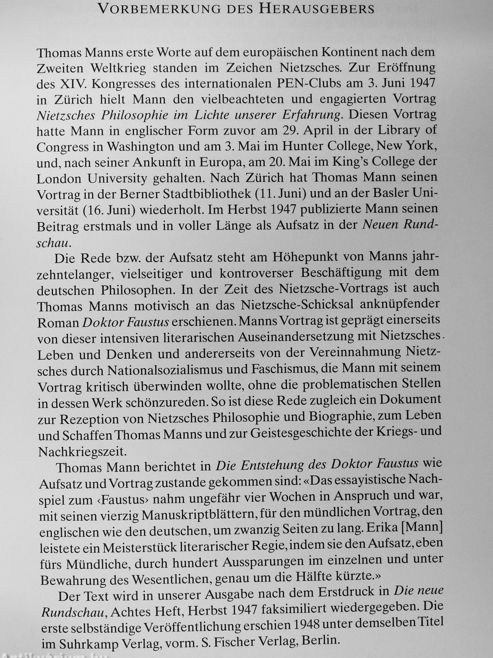 Thomas Manns erste Worte nach dem Zweiten Weltkrieg auf dem europäischen Kontinent standen im Zeichen Nietzsches. Zur Eröffnung des XIV. Kongresses des internationalen PEN-Clubs am 3. Juni 1947 in Zürich hielt Mann den vielbeachteten und engagierten Vortrag Nietzsches Philosophie im Lichte unserer Erfahrung, den er kurz darauf in ausführlicherer Form publizierte. Die Rede bzw. der Aufsatz steht am Höhepunkt von Manns jahrzehntelanger, vielseitiger und kontroverser Beschäftigung mit dem deutschen Philosophen. In der Zeit des Nietzsche-Vortrags ist auch Thomas Manns motivisch an das Nietzsche-Schicksal anküpfender Roman Doktor Faustus erschienen. Manns Vortrag ist geprägt einerseits von dieser intensiven Auseinandersetzung mit Nietzsches Leben und Denken und andererseits von der Vereinnahmung Nietzsches durch Nationalsozialismus und Faschismus, die Mann mit seinem Vortrag überwinden wollte, ohne die problematischen Stellen in seinem Werk...