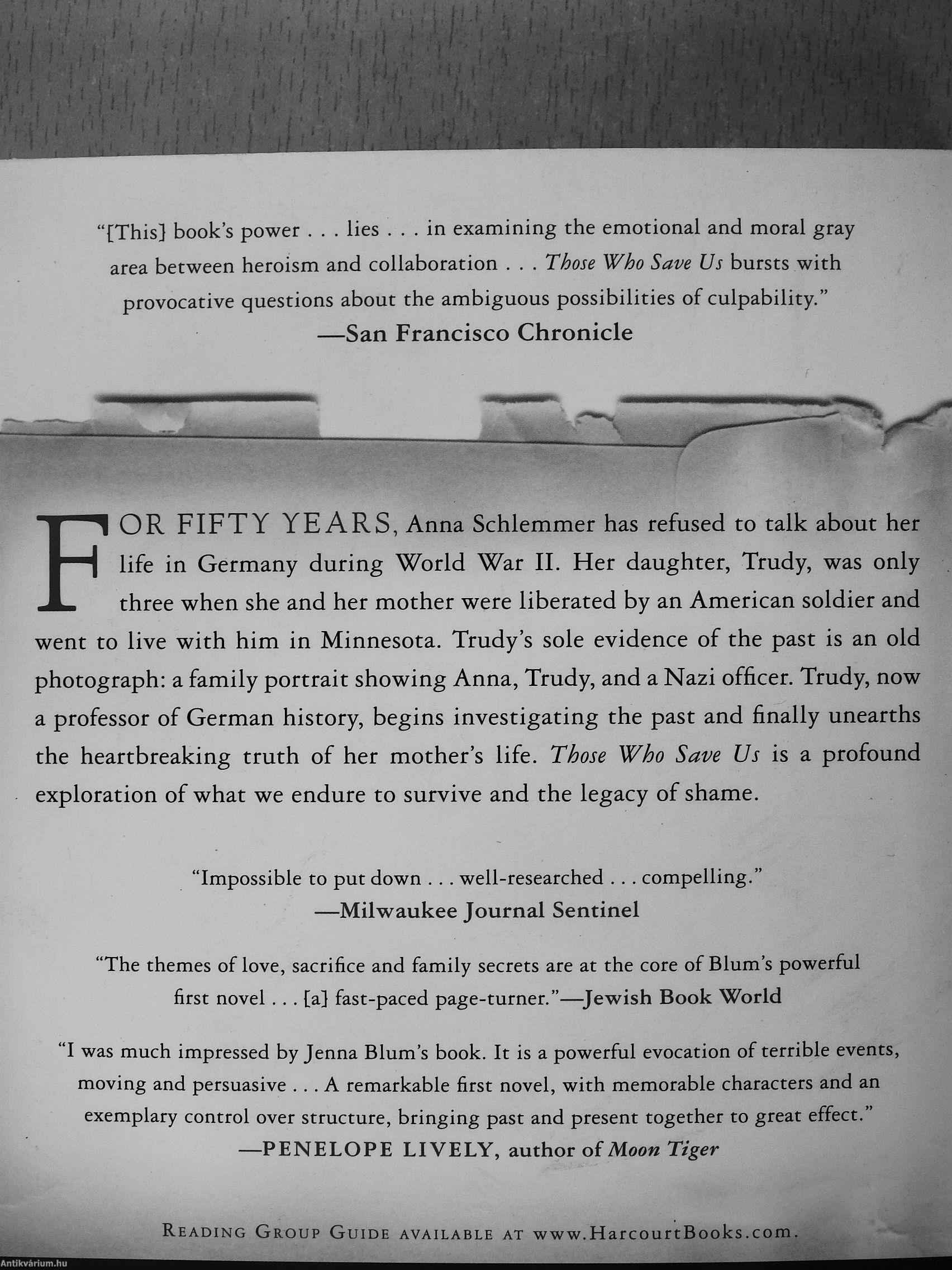 1 OR FIFTY YEARS, Anna Schlemmer has refused to talk about her life in Germany during World War II. Her daughter, Trudy, was only three when she and her mother were liberated by an American soldier and went to live with him in Minnesota. Trudy's sole evidence of the past is an old photograph: a family portrait showing Anna, Trudy, and a Nazi officer. Trudy, now a professor of German history, begins investigating the past and finally unearths the heartbreaking truth of her mother's life. Those Who Save Us is a profound exploration of what we endure to survive and the legacy of shame.