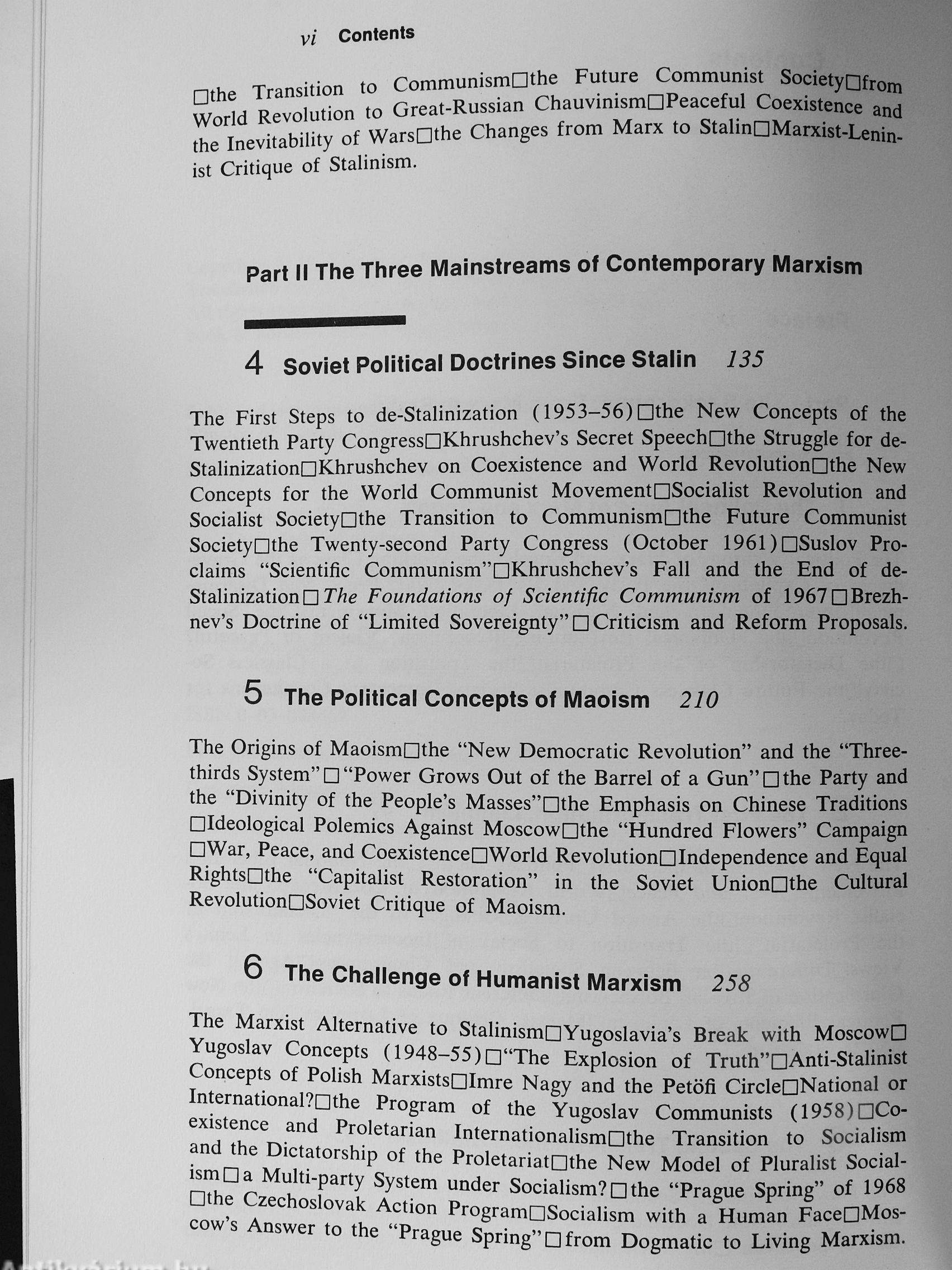 Alongside Soviet Marxism-Leninism, which justines and sustains the ruling party apparatus of the U.S.S.R., there exists today Maoism, which offers Marxists of all countries the experiences of the Chinese Revolution as an all-inclusive ideology. Finally, there appeared, among oppositional Communists in Europe, a humanist Marxism. Basing itself on the original ideas of Karl Marx, this trend of Communism offers a new model for socialist society, founded on democratic freedom, human dignity, and cooperative self-government.