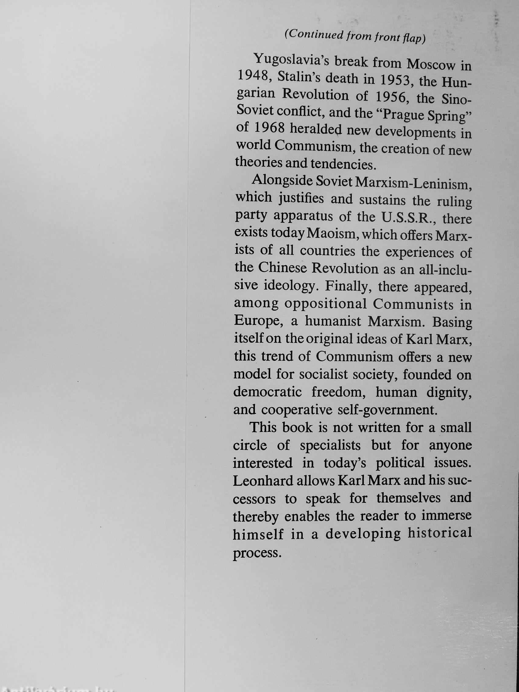 This book is not written for a small circle of specialists but for anyone interested in today's political issues. Leonhard allows Karl Marx and his successors to speak for themselves and thereby enables the reader to immerse himself in a developing historical process.
