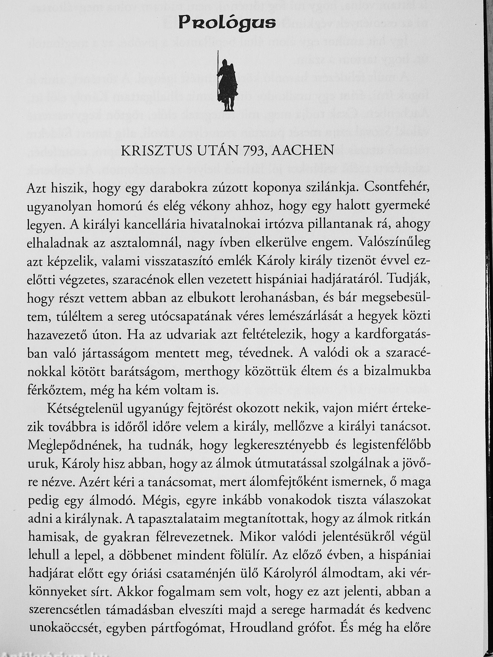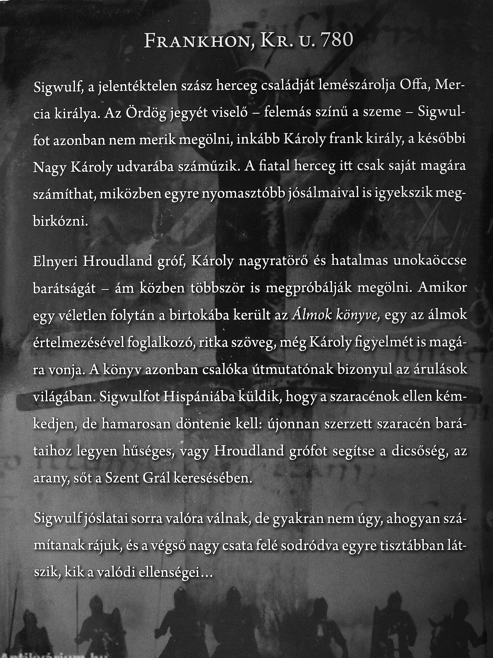 Sigwulf; a jelentéktelen szász herceg családját lemészárolja Offa; Mer-cia királya. Az Ördög jegyét viselő - felemás színű a szeme - Sigw^ul-fot azonban nem merik megölni, inkább Károly frank király, a későbbi Nagy Károly udvarába száműzik. A fiatal herceg itt csak saját magára számíthat, miközben egyre nyomasztóbb jósálmaival is igyekszik megbirkózni.