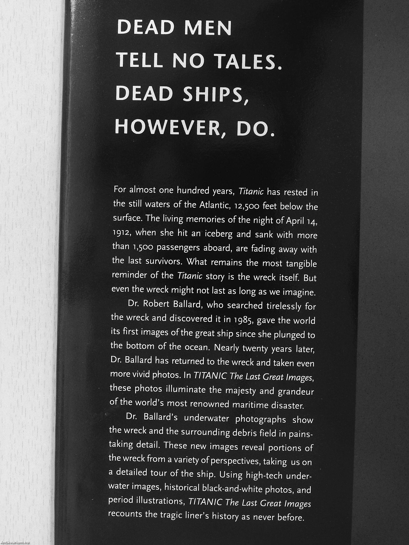 Dr. Robert Ballard, who searched tirelessly for the wreck and discovered It in 1985, gave the world its first images of the great ship since she plunged to the bottom of the ocean. Nearly twenty years later, Dr. Ballard has returned to the wreck and taken even more vivid photos. In TITANIC Tine Last Great Images, these photos illuminate the majesty and grandeur of the world's most renowned maritime disaster.