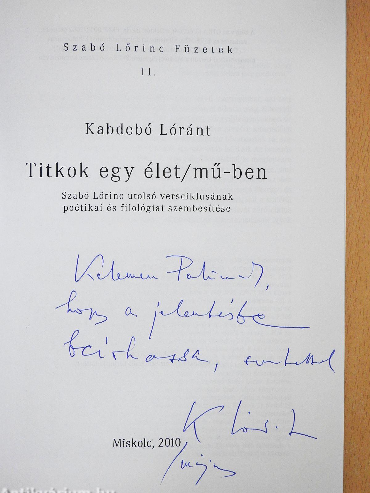 A címlapon a szerző, Kabdebó Lóránt névre szóló dedikációja látható.