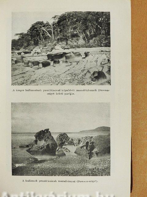 A Olowen-szirt a Hoorn-szigettől délre. Előtte elpusztult sziklapartok csonka maradványai. (Ördög-sziklák.) - A Hoornfok csendes időben. - A Navarin-sziget egyik öble. - Port Harberton a Beagle-csatorna keleti végénél. - Vancouveröböl az Államok-szigetének déli oldalán. - Hegyvidék az Államok-szigetének belsejében. - Kormorán-fészkek az egyik hullámmarta barlang fölött az Államok-szigetén 128-129