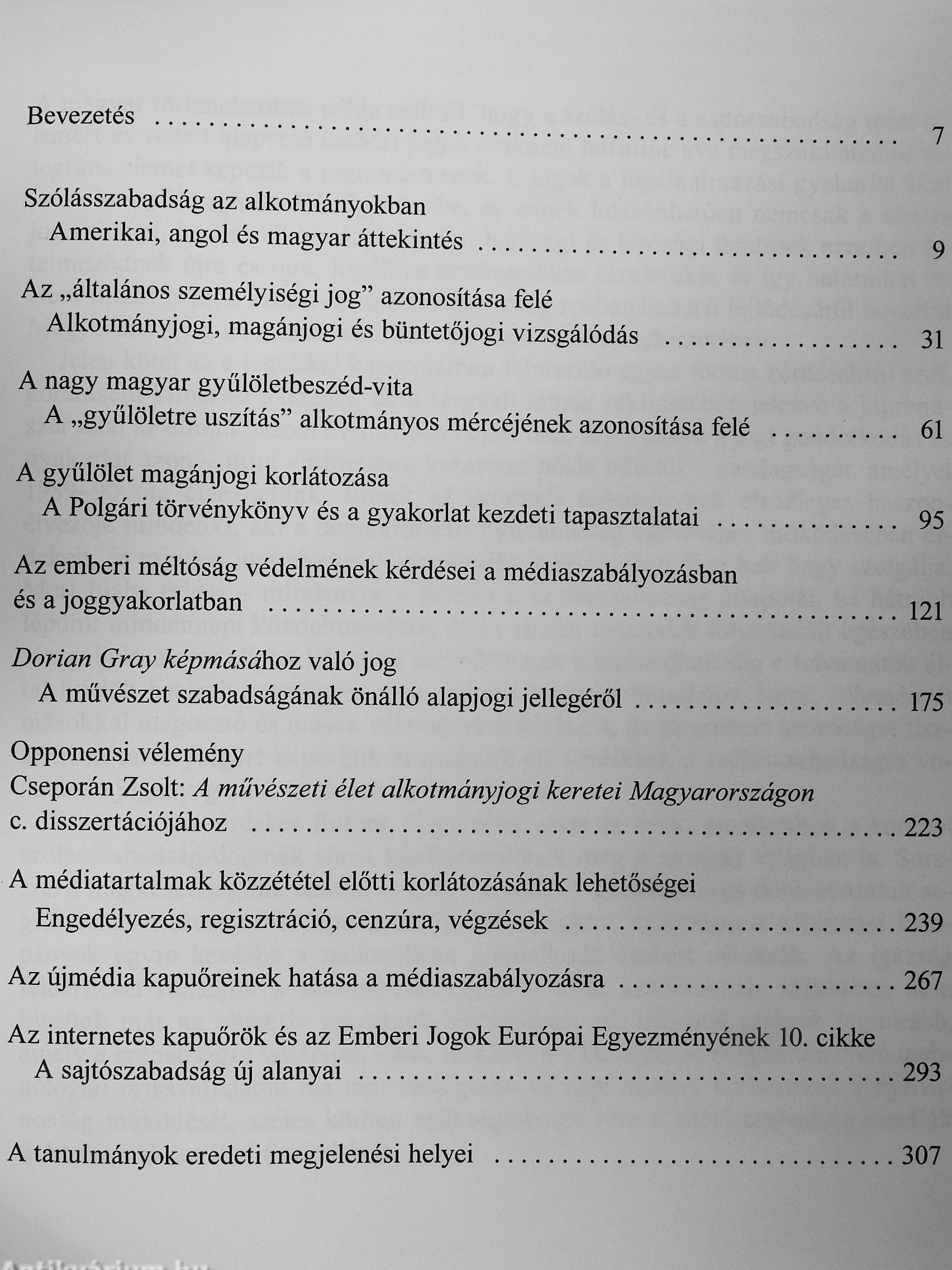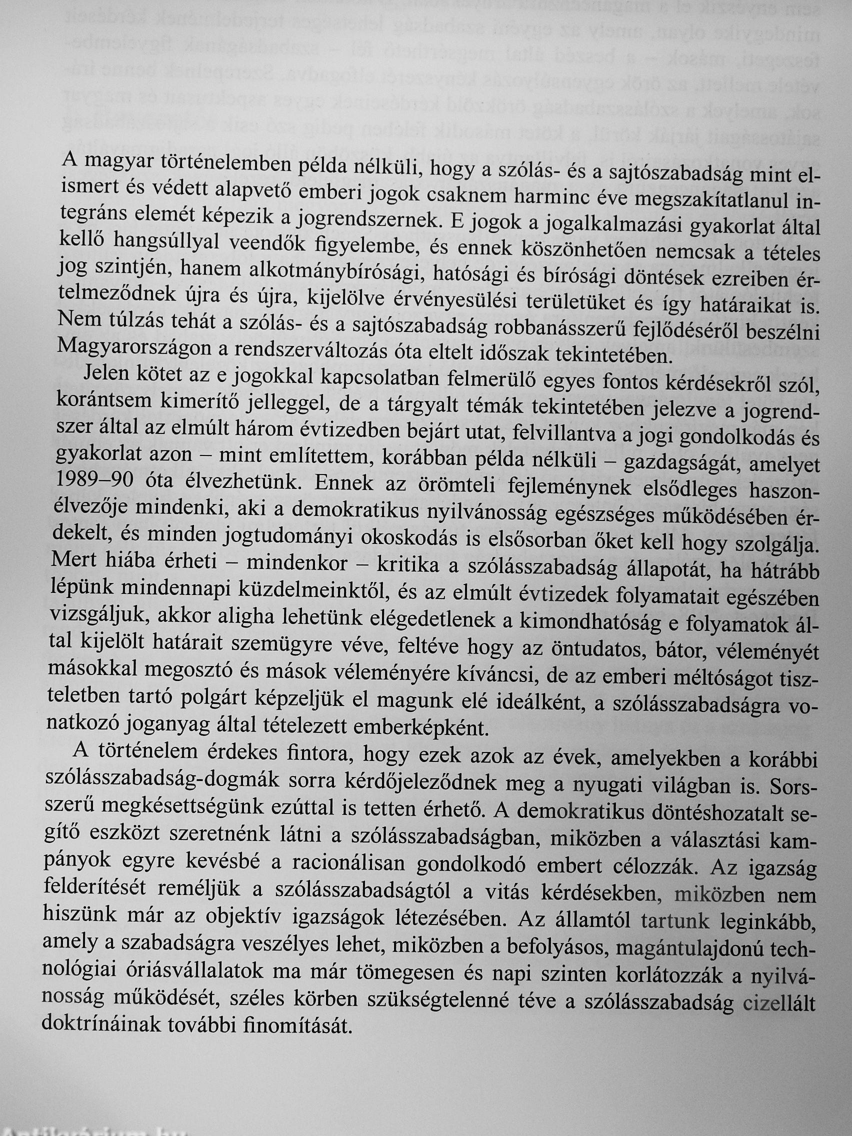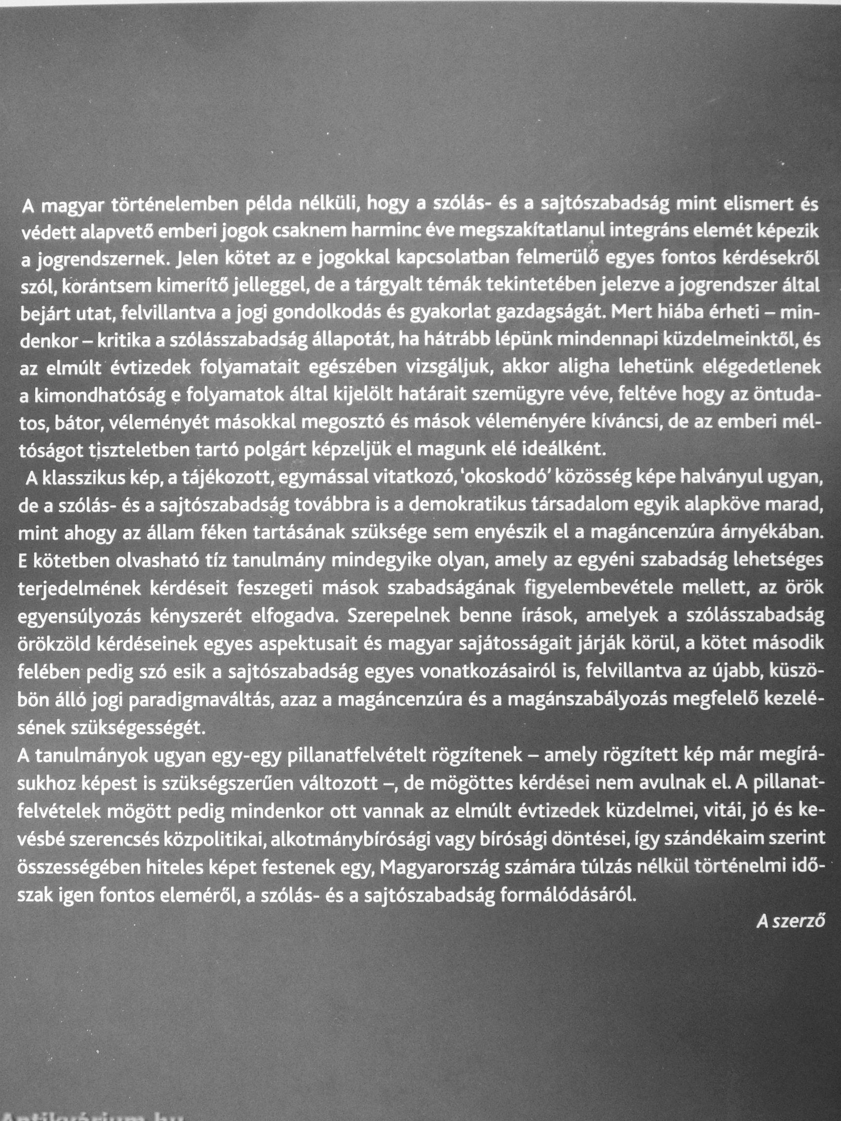 A magyar történelemben példa nélküli, hogy a szólás- és a sajtószabadság mint elismert és védett alapvető emberi jogok csaknem harminc éve megszakítatlanul integráns elemét képezik a jogrendszernek, jelen kötet az e jogokkal kapcsolatban felmerülő egyes fontos kérdésekről szól, korántsem kimerítő jelleggel, de a tárgyalt témák tekintetében jelezve a jogrendszer által bejárt utat, felvillantva a jogi gondolkodás és gyakorlat gazdagságát. Mert hiába érheti - mindenkor-kritika a szólásszabadság állapotát, ha hátrább lépünk mindennapi küzdelmeinktől, és az elmúlt évtizedek folyamatait egészében vizsgáljuk, akkor aligha lehetünk elégedetlenek a kimondhatóság e folyamatok által kijelölt határait szemügyre véve, feltéve hogy az öntudatos, bátor, véleményét másokkal megosztó és mások véleményére kíváncsi, de az emberi méltóságot tiszteletben tartó polgárt képzeljük el magunk elé ideálként. A klasszikus kép, a tájékozott, egymással vitatkozó, 'okoskodó' közösség képe halványul ugyan, de a szólás- és a sajtószabadság továbbra is a demokratikus társadalom egyik alapköve marad, mint ahogy az állam féken tartásának szüksége sem enyészik el a magáncenzúra árnyékában. E kötetben olvasható tíz tanulmány mindegyike olyan, amely az egyéni szabadság lehetséges terjedelmének kérdéseit feszegeti mások szabadságának figyelembevétele mellett, az örök egyensúlyozás kényszerét elfogadva. Szerepelnek benne írások, amelyek a szólásszabadság örökzöld kérdéseinek egyes aspektusait és magyar sajátosságait járják körül, a kötet második felében pedig szó esik a sajtószabadság egyes vonatkozásairól is, felvillantva az újabb, küszöbön álló jogi paradigmaváltás, azaz a magáncenzúra és a magánszabályozás megfelelő kezelésének szükségességét.