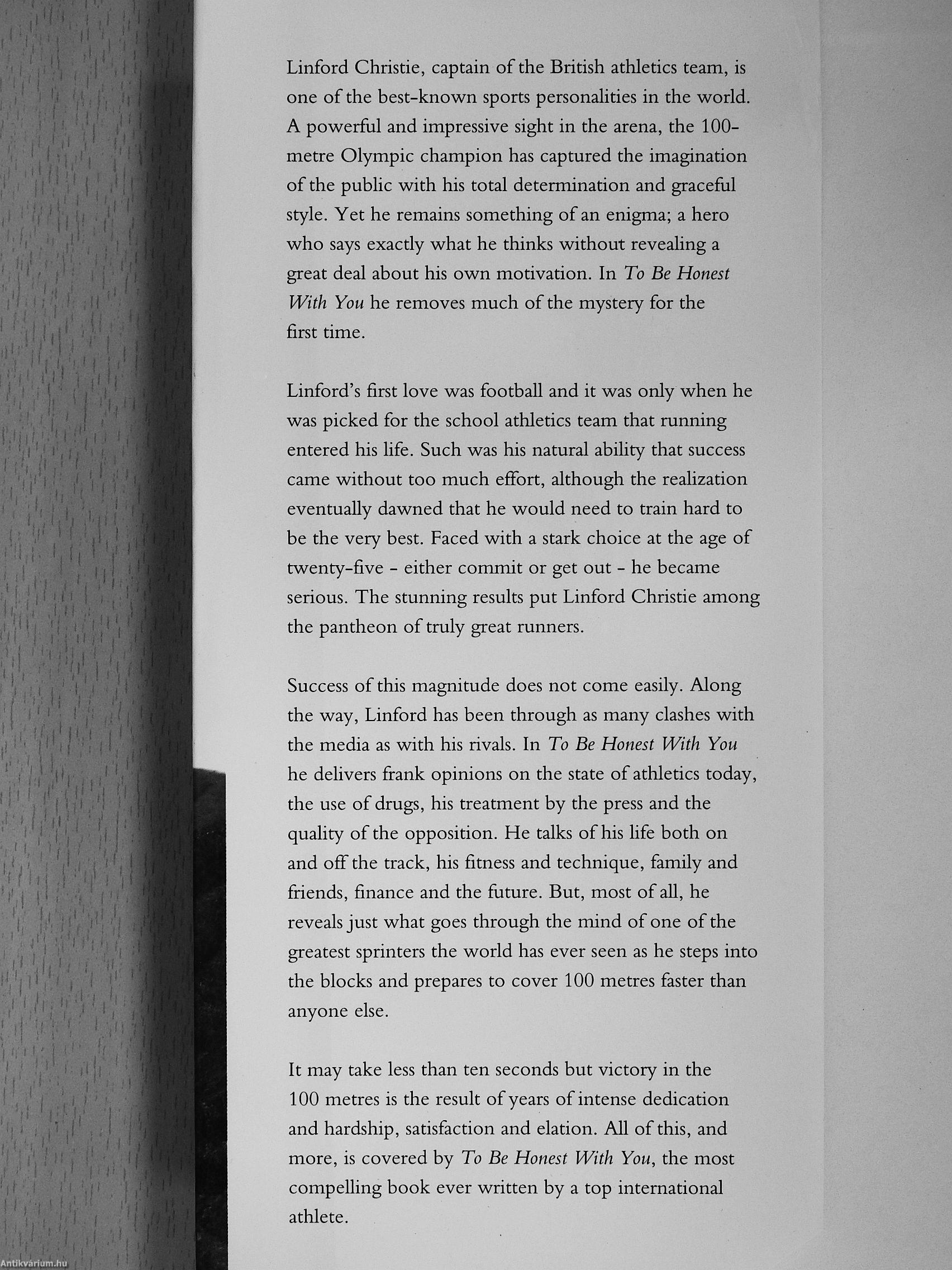 Linford Christie, captain ofthe British athletics team, is one of the best-known sports personalities in the world. A powerful and impressive sight in the arena, the 100-metre Olympic champion has captured the imagination of the public with his total determination and graceful style. Yet he remains something of an enigma; a hero who says exactly what he thinks without reveahng a great deal about his own motivation. In To Be Honest With You he removes much of the mystery for the first time.