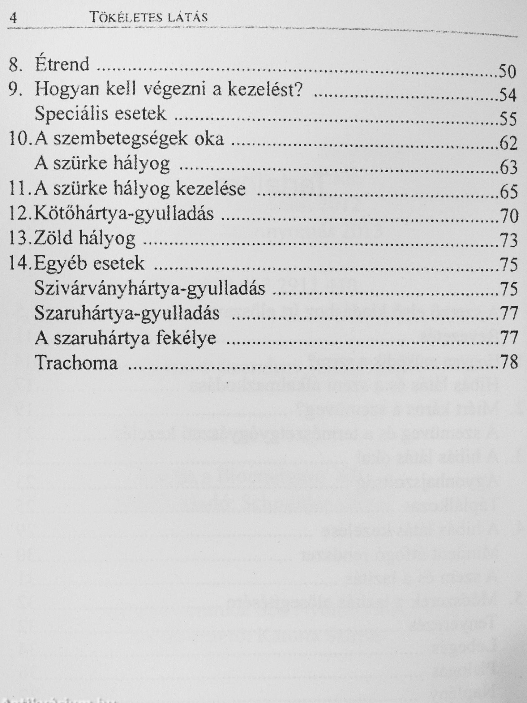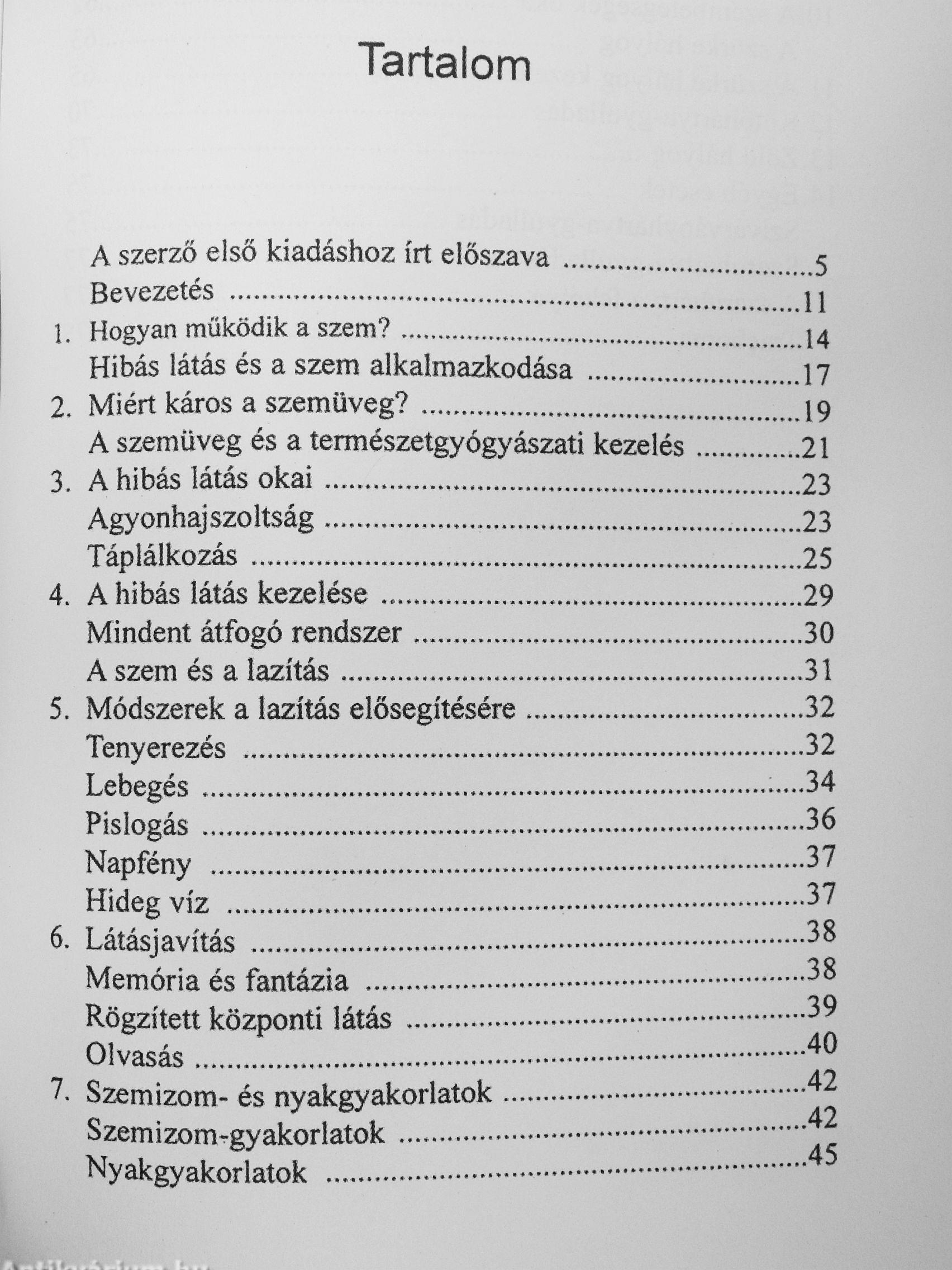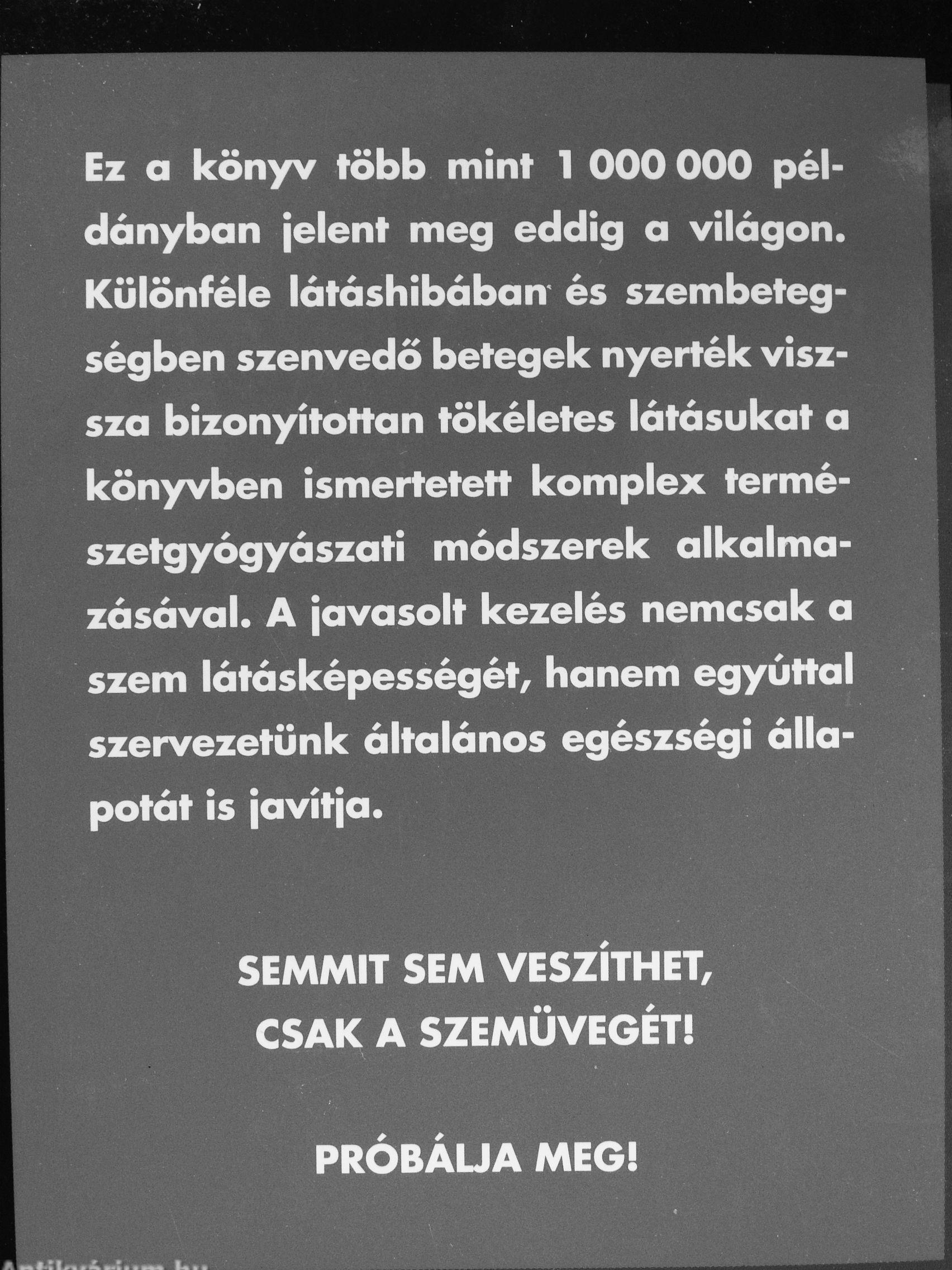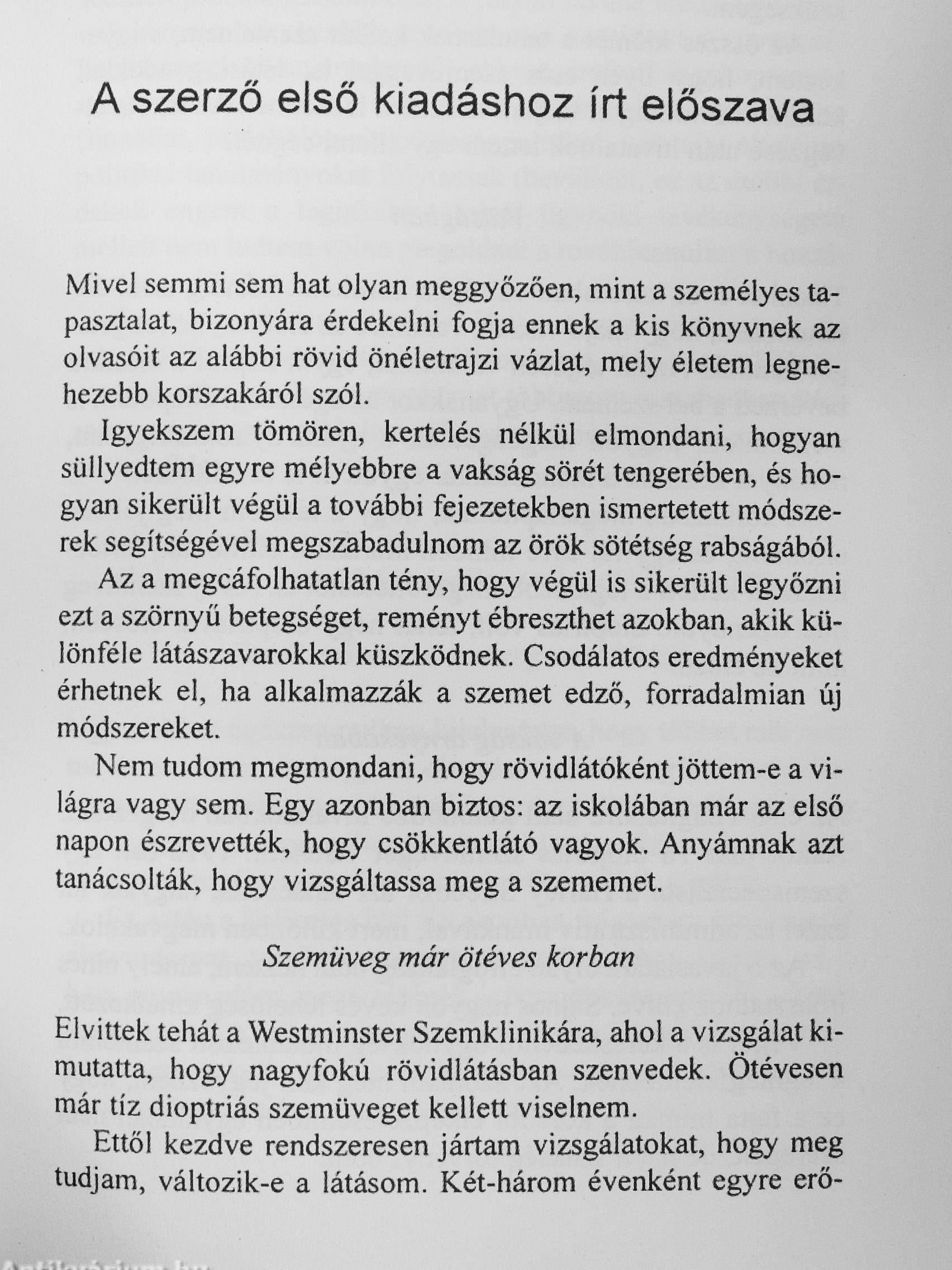 Ez a könyv több mint 1 000 000 példányban jelent meg eddig a világon. Különféle látáshibában és szembetegségben szenvedő betegek nyerték visz-sza bizonyítottan tökéletes látásukat a könyvben ismertetett komplex természetgyógyászati módszerek alkalmazásával. A javasolt kezelés nemcsak a szem látásképességét, hanem egyúttal szervezetünk általános egészségi állapotát is javítja.