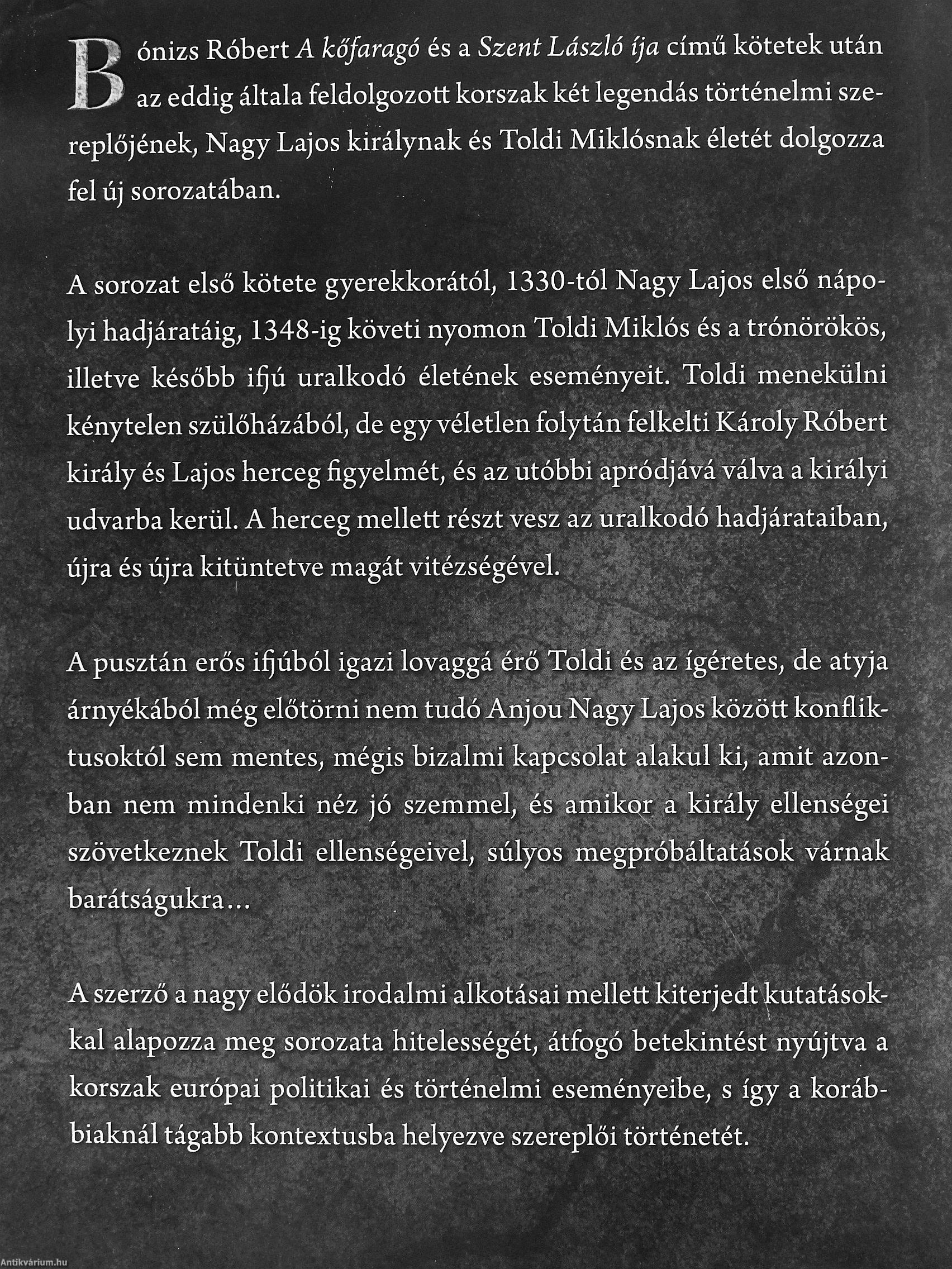 Bónizs Róbert A kőfaragó és a Szent László íja című kötetek után az eddig általa feldolgozott korszak két legendás történelmi szereplőjének, Nagy Lajos királynak és Toldi Miklósnak életét dolgozza fel új sorozatában.