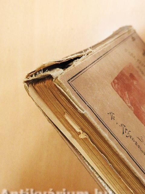 A gerinc részben elvált a könyvtesttől, a borító foltos és kopott. Az előzéklap és néhány lap kijár. A 15-16. és a 241-247. oldal és a tartalomjegyzék hiányzik a könyvből. A 121. oldal szöveghiányos. A címlapon tulajdonosi bejegyzés található.