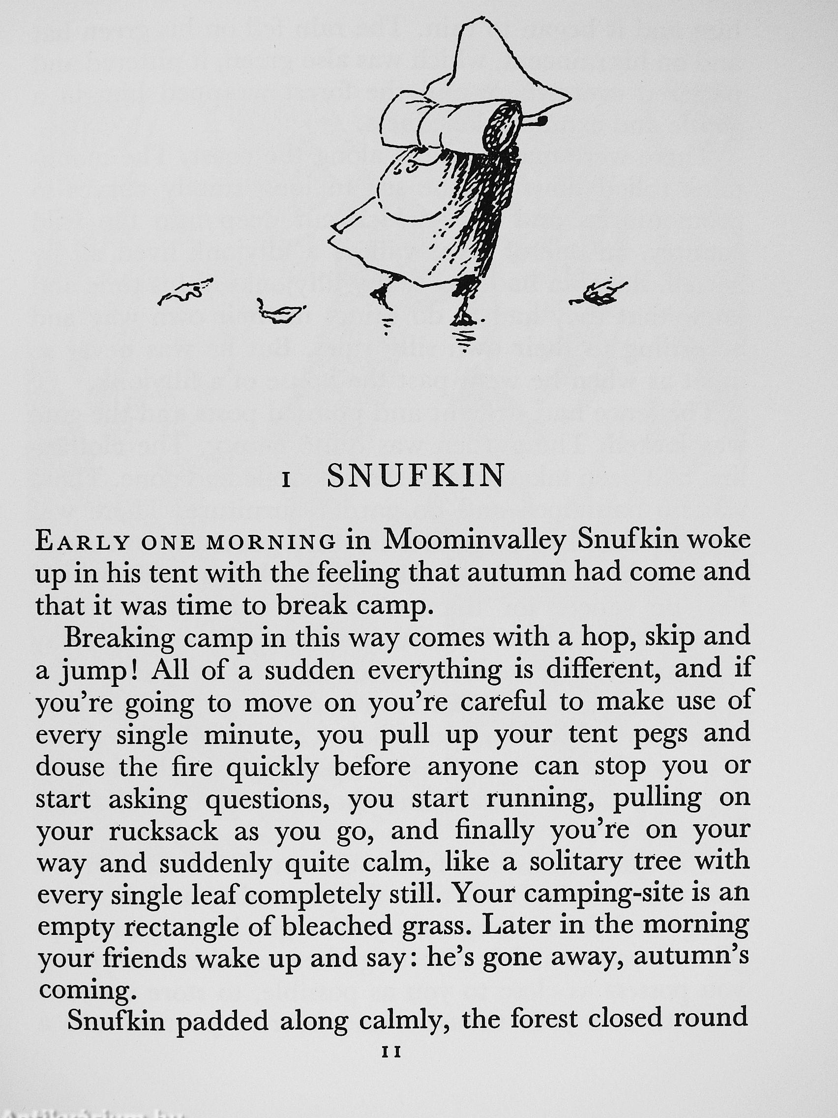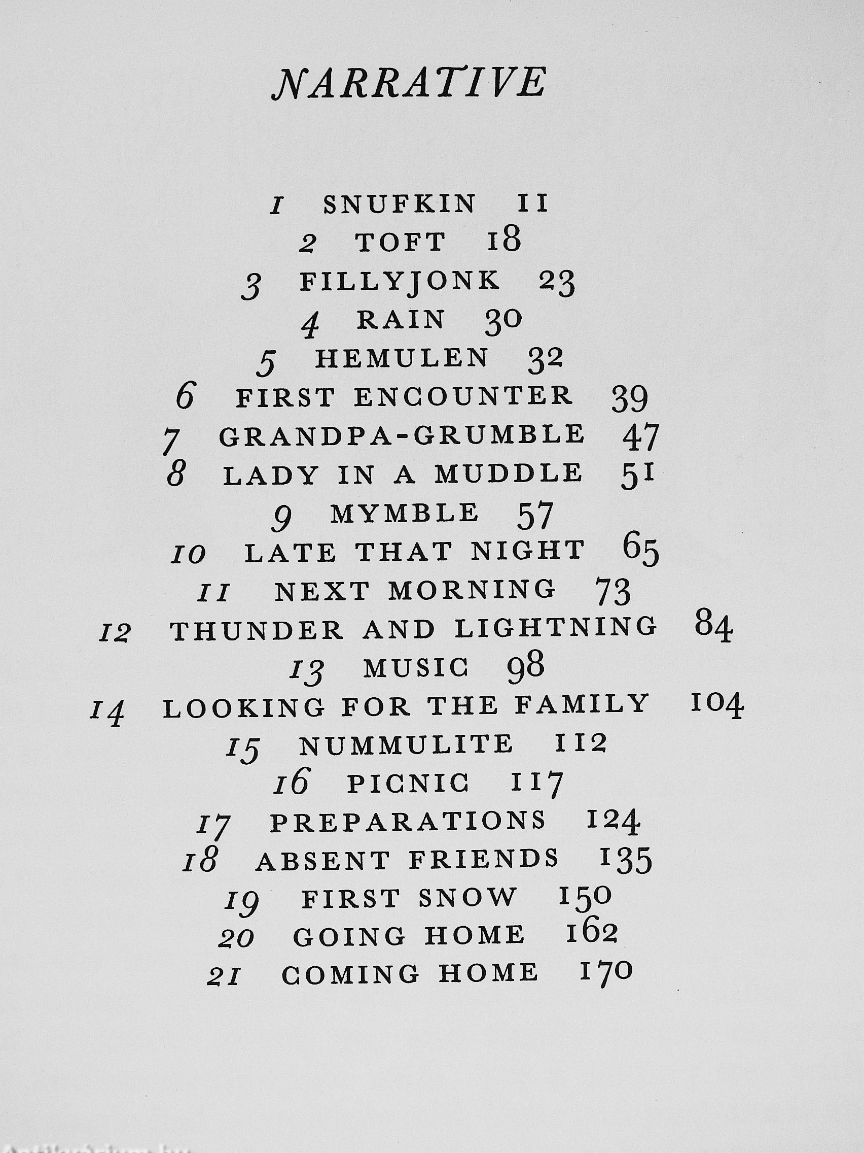 Snufkin is the first to set oif for Moominvalley—to see if he can discover again the opening notes of a new tune that he had made up there during the summer. He is followed by little Toft who has been dreaming of visiting the Moomin's garden and seeing the roimd friendly nose of Moomirmiamma. Fillyjonk, after her terrifying experiences with autumn-cleaning, feels she must visit the Moomins. And Grandpa-Grumble, when he had remembered his name and what he wanted to do, put on his dressing gown and gaiters and set off to fish from the little bridge in Moominvalley.
