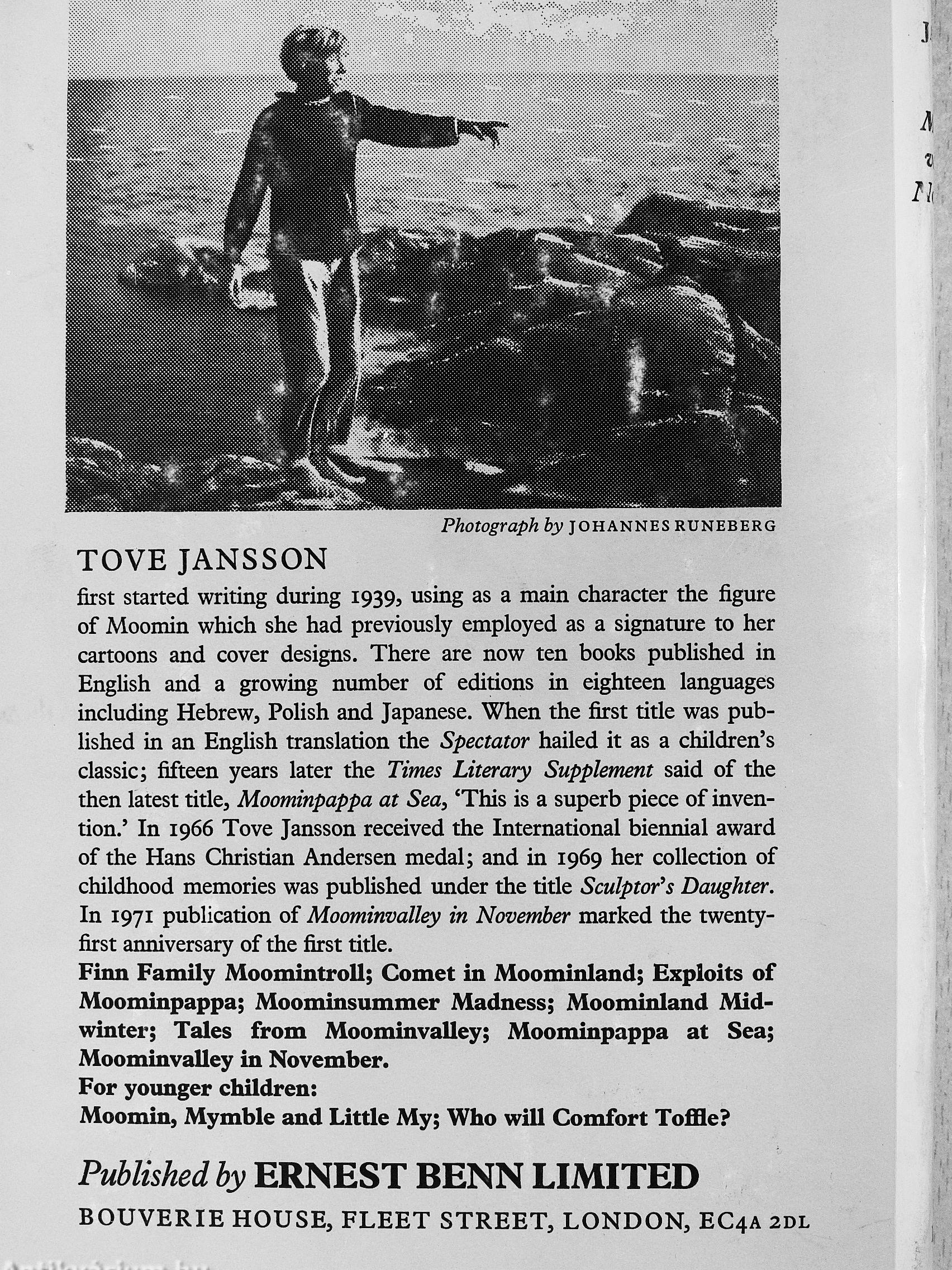 first started writing during 1939, using as a main character the figure of Moomin which she had previously employed as a signature to her cartoons and cover designs. There are now ten books published in English and a growing number of editions in eighteen languages including Hebrew, Polish and Japanese. When the first title was published in an English translation the Spectator hailed it as a children's classic; fifteen years later the Times Literary Supplement said of the then latest title, Moominpappa at Sea, 'This is a superb piece of invention.' In 1966 Tove Jansson received the International biennial award of the Hans Christian Andersen medal; and in 1969 her collection of childhood memories was published under the title Sculptor's Daughter. In 1971 publication of Moominvall^ in November marked the twenty-first anniversary of the first title.