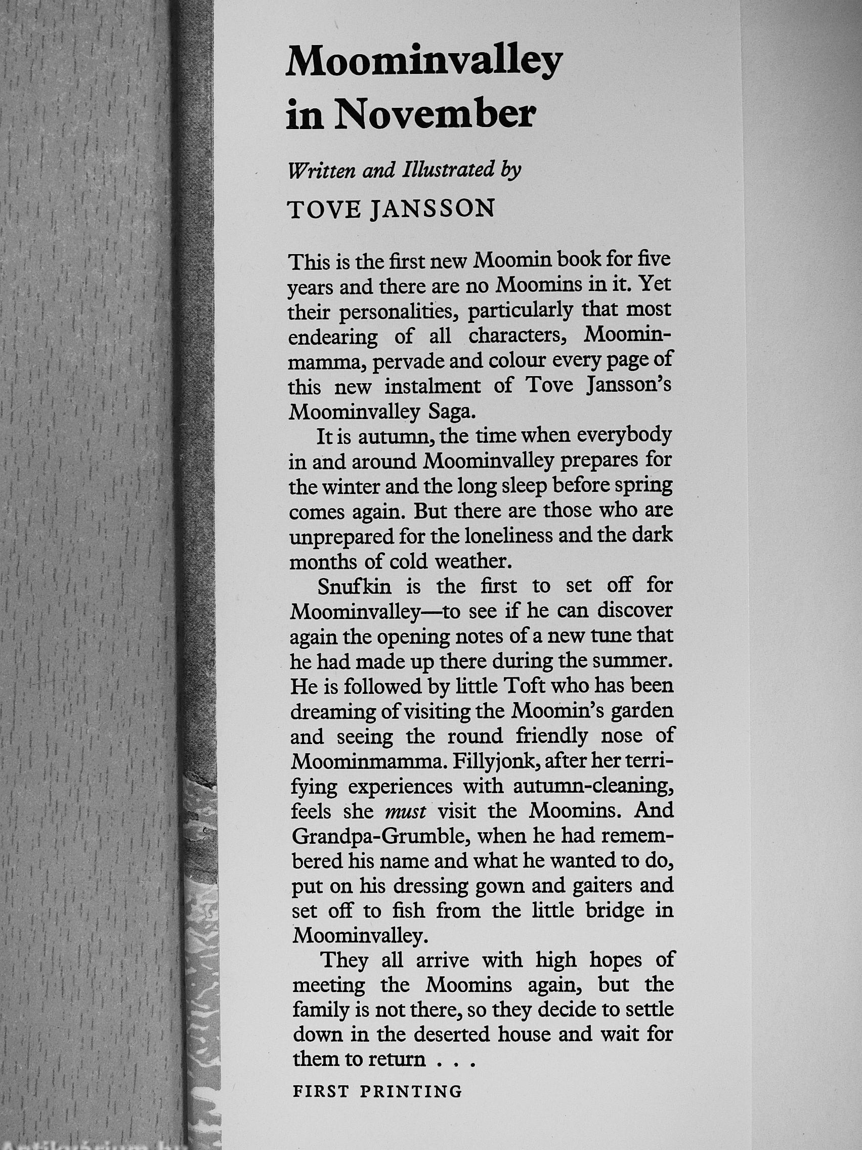 It is autumn, the time when everybody in and aroimd Moominvalley prepares for the winter and the long sleep before spring comes again. But there are those who are unprepared for the loneliness and the dark months of cold weather.