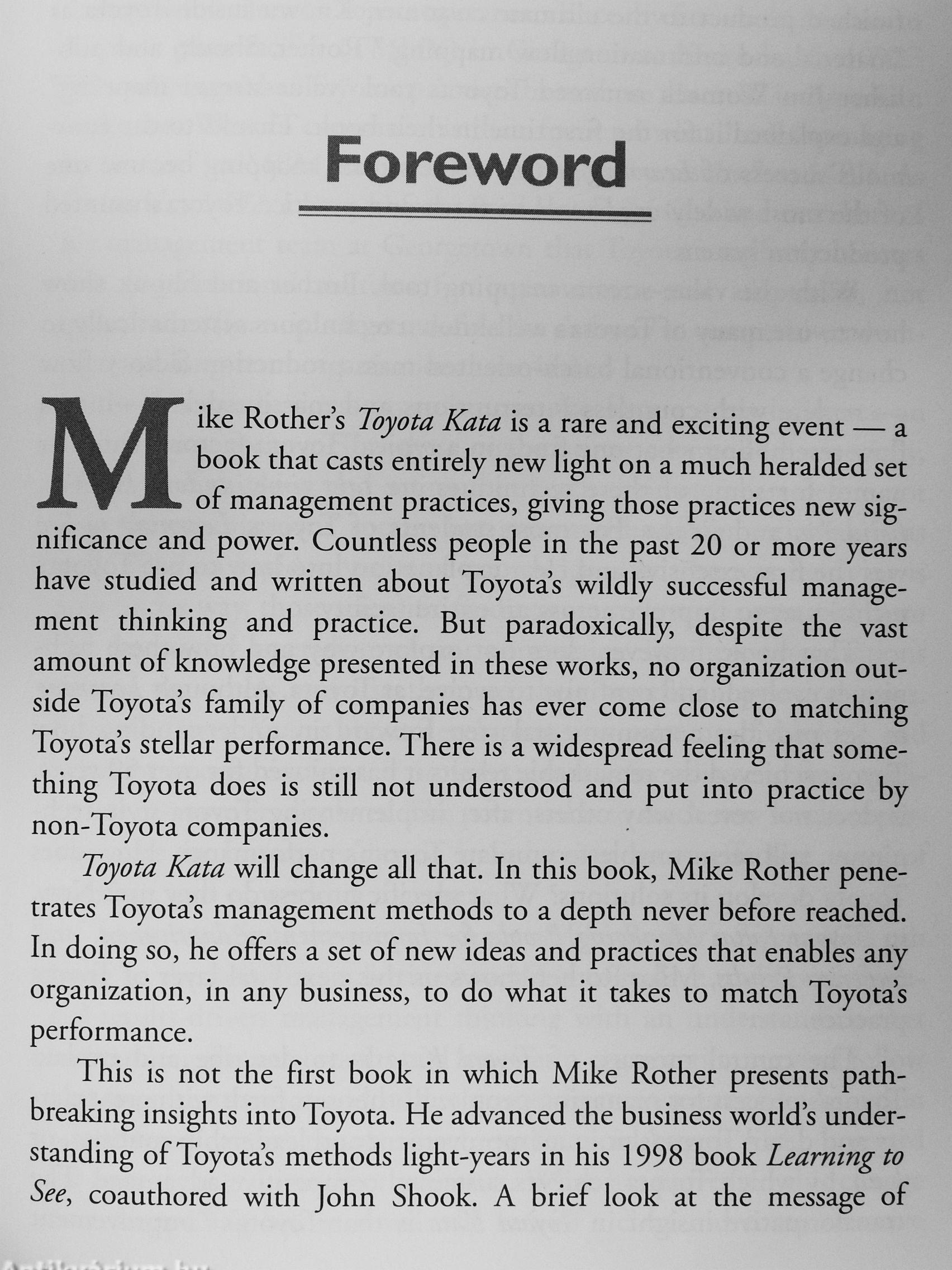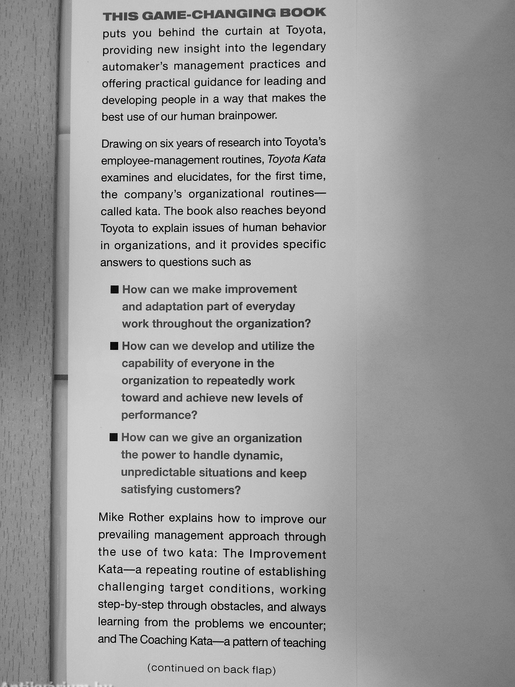 In Toyota Kata, two-tinne Shingo Prize-winning author IVIike Rother provides a close look at Toyota's employee management methods. He examines the company's unique leadership routines (kata) that create Toyota's legendary continuous improvement and adaptation—and explains how you can develop these routines in your own organization!