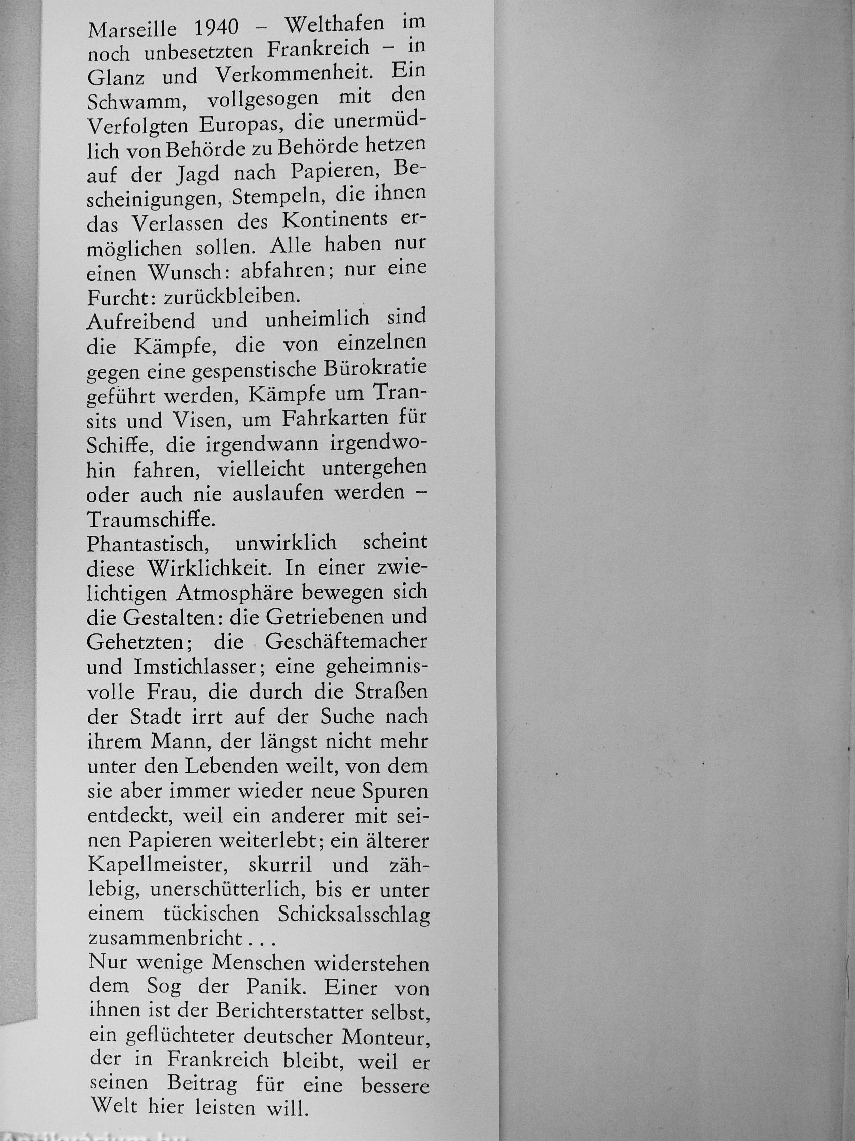 Marseille 1940 - Welthafen im noch unbesetzten Frankreich - in Glanz und Verkommenheit. Ein Schwamm, vollgesogen mit den Verfolgten Europas, die unermüdlich von Behörde zu Behörde hetzen auf der Jagd nach Papieren, Bescheinigungen, Stempeln, die ihnen das Verlassen des Kontinents ermöglichen sollen. Alle haben nur einen Wunsch: abfahren; nur eine Furcht: zurückbleiben. Aufreibend und unheimlich sind die Kämpfe, die von einzelnen gegen eine gespenstische Bürokratie geführt werden, Kämpfe um Transits und Visen, um Fahrkarten für Schiffe, die irgendwann irgendwohin fahren, vielleicht untergehen oder auch nie auslaufen werden -Traumschiffe.