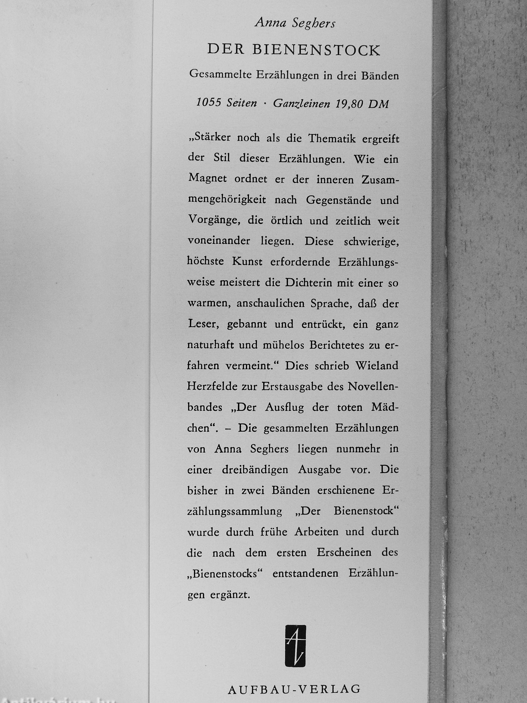 „Stärker noch als die Thematik ergreift der Stil dieser Erzählungen. Wie ein Magnet ordnet er der inneren Zusammengehörigkeit nach Gegenstände und Vorgänge, die örtlich und zeitlich weit voneinander liegen. Diese schwierige, höchste Kunst erfordernde Erzählungsweise meistert die Dichterin mit einer so warmen, anschaulichen Sprache, daß der Leser, gebannt und entrückt, ein ganz naturhaft und mühelos Berichtetes zu erfahren vermeint." Dies schrieb Wieland Herzfelde zur Erstausgabe des Novellenbandes „Der Ausflug der toten Mädchen". - Die gesammelten Erzählungen von Anna Seghers liegen nunmehr in einer dreibändigen Ausgabe vor. Die bisher in zwei Bänden erschienene Erzählungssammlung „Der Bienenstock" wurde durch frühe Arbeiten und durch die nach dem ersten Erscheinen des „Bienenstocks" entstandenen Erzählungen ergänzt.