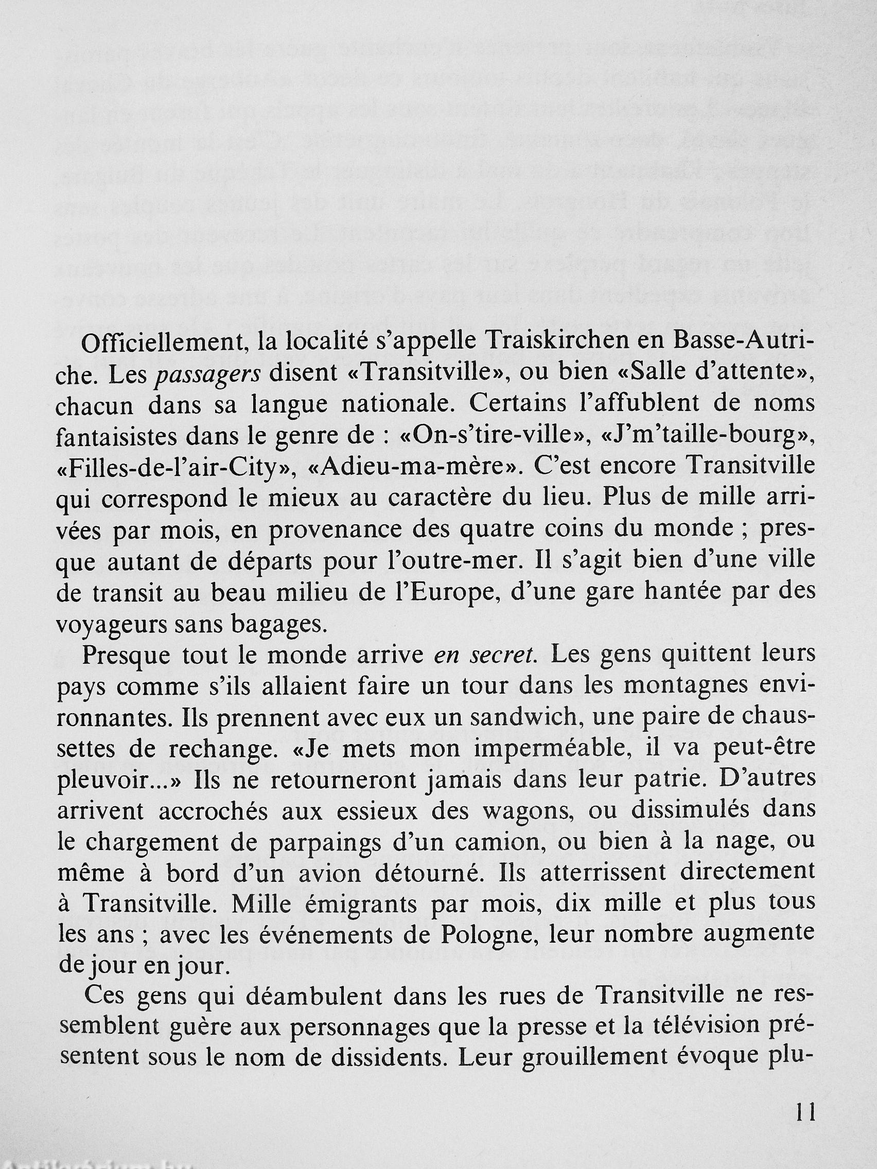 Officiellement la localité s'appelle Traiskirchen. Les passagers en transit disent « Transitville », ou bien « la salle d'attente », chacun dans sa langue nationale. Certains l'affublent de noms fantaisistes, dans le genre « On s'tire en ville », « Je m'taille-bourg », « Filles de l'air City », « Adieu ma mere » Plus de mille arrivages par mois : il s'agit bien d'une ville de transit, au cour de l'Europe, a deux pas de Vienne; une gare de triage hantée par des voyageurs sans bagages, presque tous arrivés en secret.