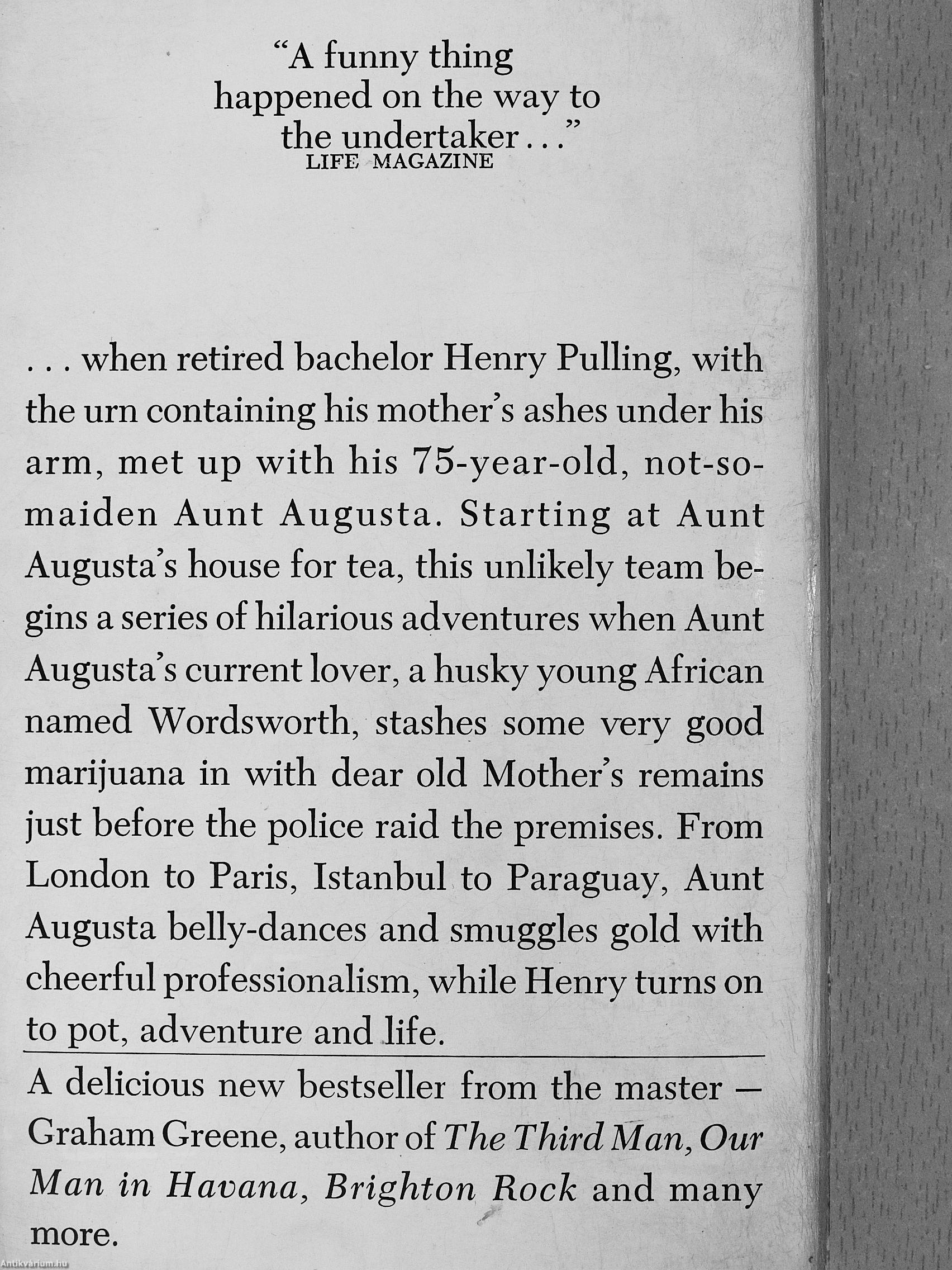 . . . when retired bachelor Henry Pulling, with the urn containing his mother's ashes under his arm, met up with his 75-year-old, not-so-maiden Aunt Augusta. Starting at Aunt Augusta's house for tea, this unlikely team begins a series of hilarious adventures when Aunt Augusta's current lover, a husky young African named Wordsworth, stashes some very good marijuana in with dear old Mother's remains just before the police raid the premises. From London to Paris, Istanbul to Paraguay, Aunt Augusta belly-dances and smuggles gold with cheerful professionalism, while Henry turns on