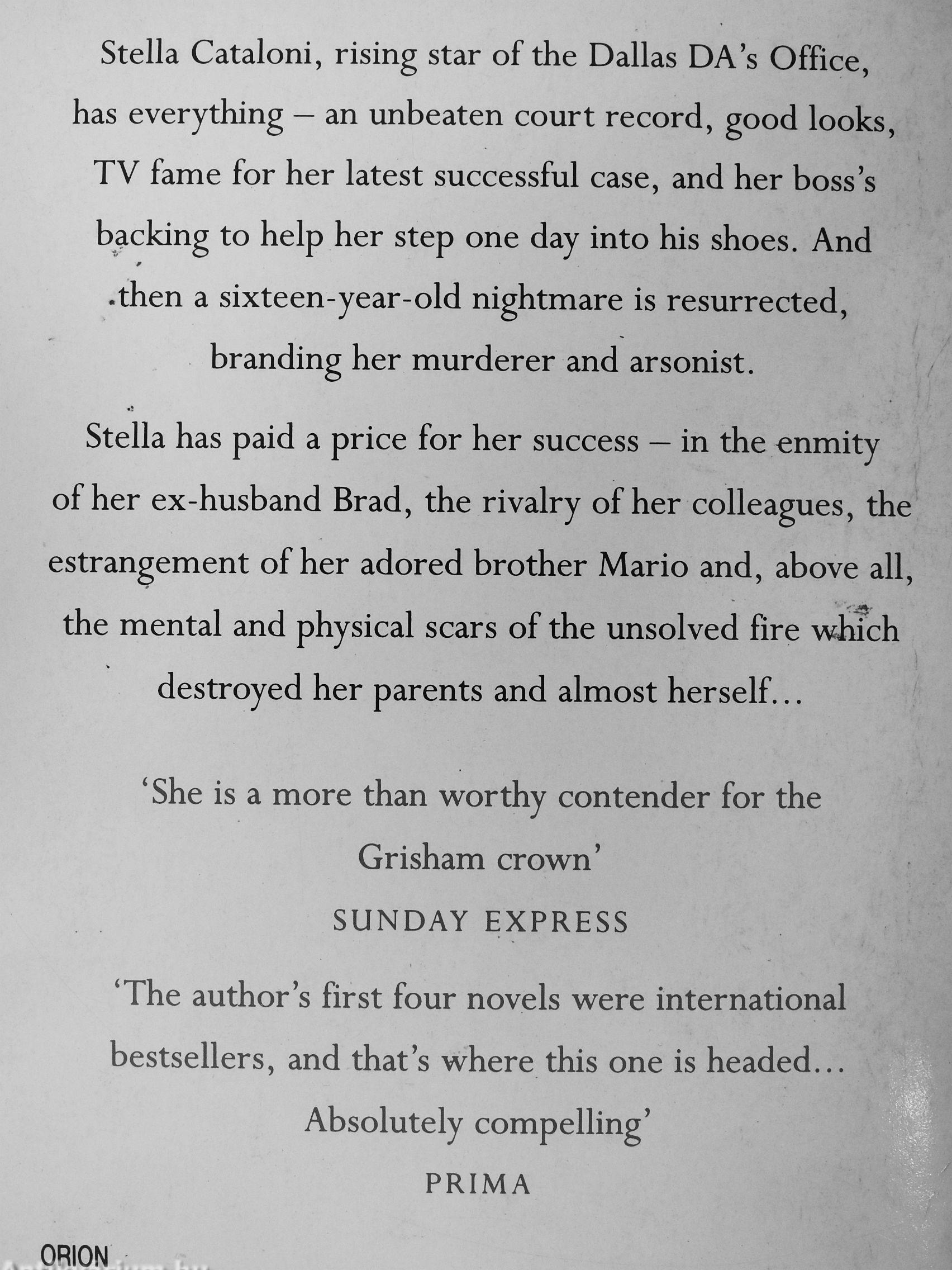 Stella Cataloni, rising star of the Dallas DA's Office, has everything - an unbeaten court record, good looks, TV fame for her latest successful case, and her boss's backing to help her step one day into his shoes. And -then a sixteen-year-old nightmare is resurrected, branding her murderer and arsonist.