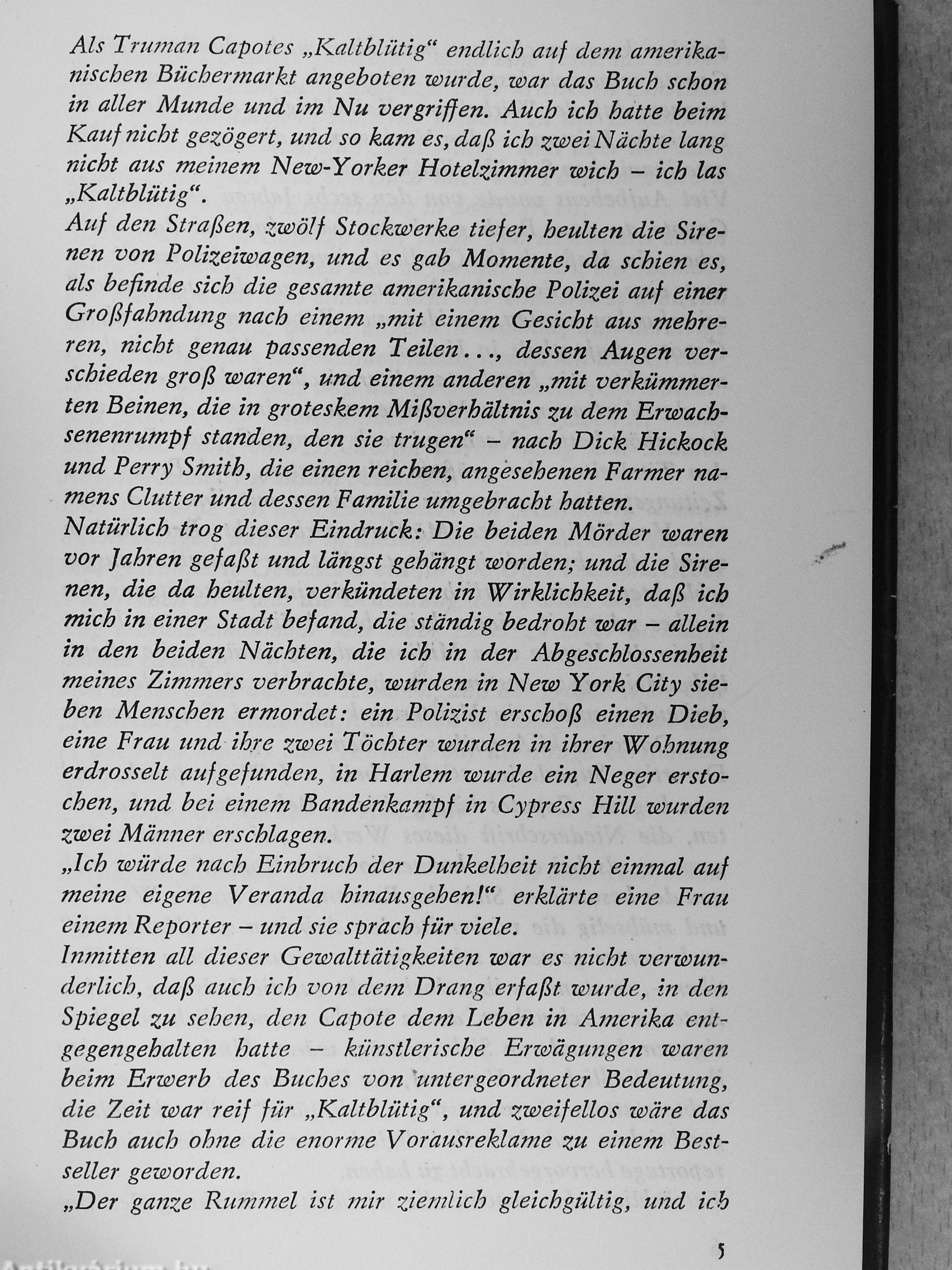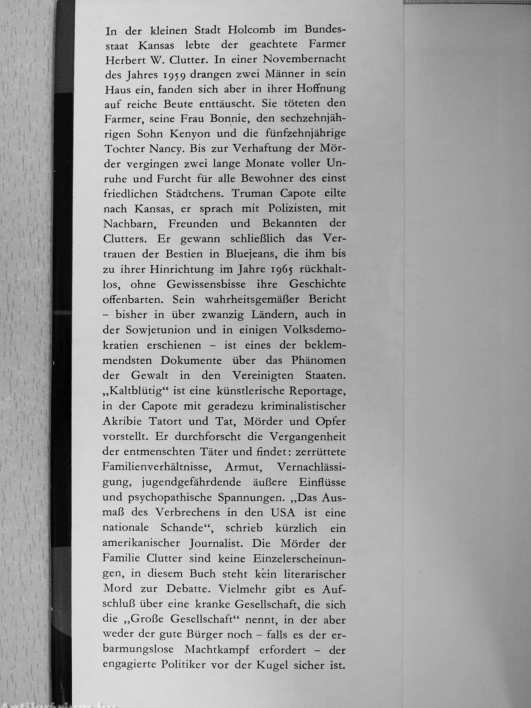 In der kleinen Stadt Holcomb im Bundesstaat Kansas lebte der geachtete Farmer Herbert W. Clutter. In einer Novembernacht des Jahres 1959 drangen zwei Männer in sein Haus ein, fanden sich aber in ihrer Hoffnung auf reiche Beute enttäuscht. Sie töteten den Farmer, seine Frau Bonnie, den sechzehnjährigen Sohn Kenyon und die fünfzehnjährige Tochter Nancy. Bis zur Verhaftung der Mörder vergingen zwei lange Monate voller Unruhe und Furcht für alle Bewohner des einst friedlichen Städtchens. Truman Capote eilte nach Kansas, er sprach mit Polizisten, mit Nachbarn, Freunden und Bekannten der Clutters. Er gewann schließlich das Vertrauen der Bestien in Bluejeans, die ihm bis zu ihrer Hinrichtung im Jahre 1965 rückhaltlos, ohne Gewissensbisse ihre Geschichte offenbarten. Sein wahrheitsgemäßer Bericht - bisher in über zwanzig Ländern, auch in der Sowjetunion und in einigen Volksdemokratien erschienen - ist eines der beklemmendsten Dokumente über das Phänomen der Gewalt in den Vereinigten Staaten. „Kaltblütig" ist eine künstlerische Reportage, in der Capote mit geradezu kriminalistischer Akribie Tatort und Tat, Mörder und Opfer vorstellt. Er durchforscht die Vergangenheit der entmenschten Täter und findet: zerrüttete Familienverhältnisse, Armut, Vernachlässigung, jugendgefährdende äußere Einflüsse und psychopathische Spannungen. „Das Ausmaß des Verbrechens in den USA ist eine nationale Schande", schrieb kürzlich ein amerikanischer Journahst. Die Mörder der Familie Clutter sind keine Einzelerscheinungen, in diesem Buch steht kein literarischer Mord zur Debatte. Vielmehr gibt es Aufschluß über eine kranke Gesellschaft, die sich die „Große Gesellschaft" nennt, in der aber weder der gute Bürger noch - falls es der erbarmungslose Machtkampf erfordert - der engagierte Politiker vor der Kugel sicher ist.