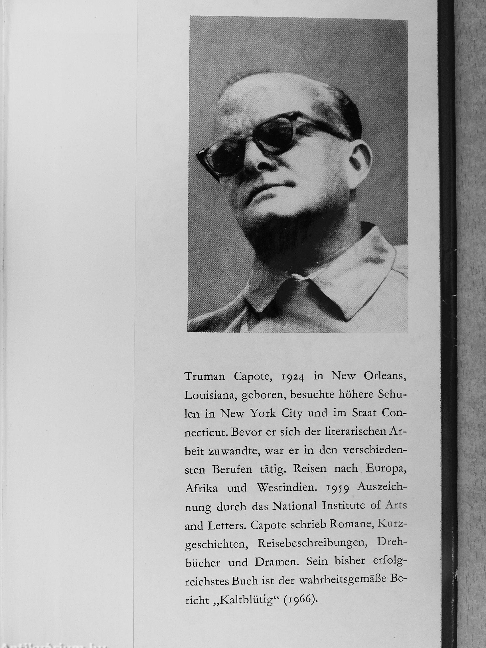Truman Capote, 1924 in New Orleans, Louisiana, geboren, besuchte höhere Schulen in New York City und im Staat Connecticut. Bevor er sich der literarischen Arbeit zuwandte, war er in den verschiedensten Berufen tätig. Reisen nach Europa, Afrika und Westindien. 1959 Auszeichnung durch das National Institute of Arts and Letters. Capote schrieb Romane, Kurzgeschichten, Reisebeschreibungen, Drehbücher und Dramen. Sein bisher erfolgreichstes Buch ist der wahrheitsgemäße Bericht „Kaltblütig" (i 966).