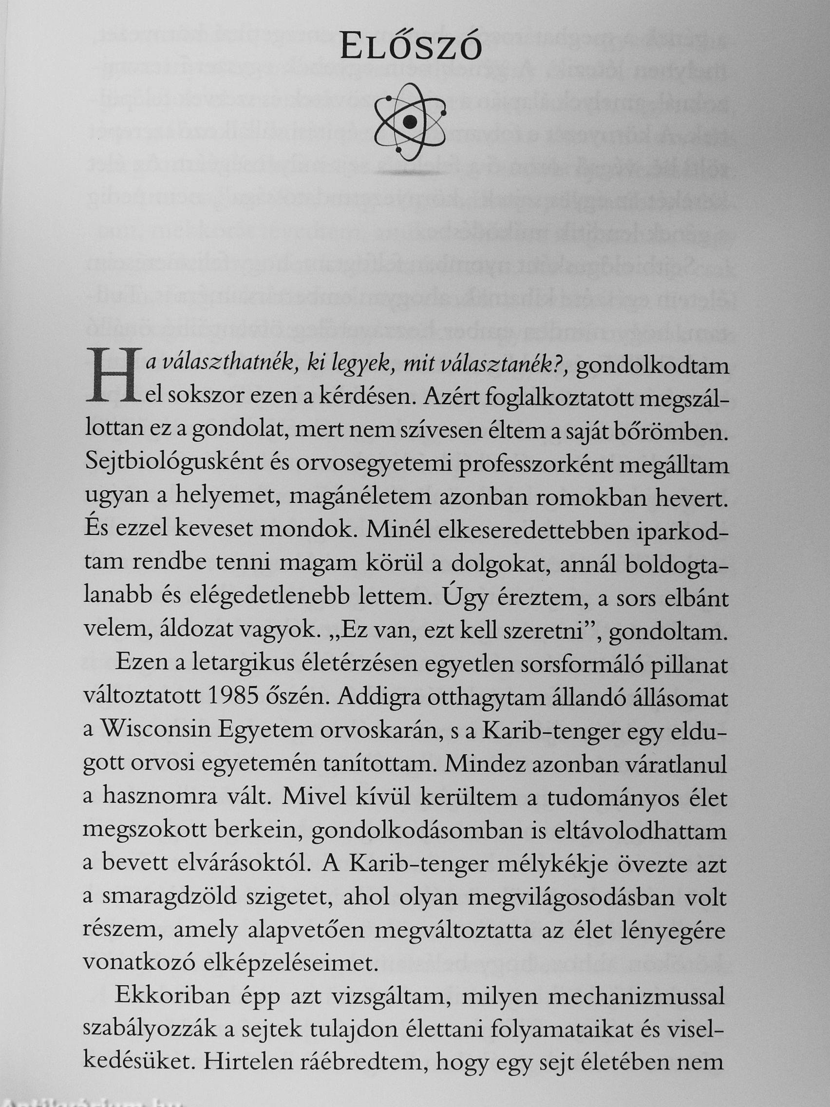 „Az élet természetére vonatkozó felismeréseim engem is meglepetésszerűen értek. Közel két évtizeden át a biológia központi dogmáját - miszerint az életet gének szabályozzák - programoztam orvostanhallgatók agyába. Másfelől nem is voltam olyan nagyon meglepve. Ösztönösen mindig is éreztem, hogy valami nincs rendjén a genetikai determinizmussal mindenesetre feldobott, hogy nézeteim megváltoztatásával az életemet is átformálhatom. Eltöltött a lelkesedés, amikor rájöttem, hogy a tudomány útját járva áldozatból sorsom kovácsává léphetek elő."