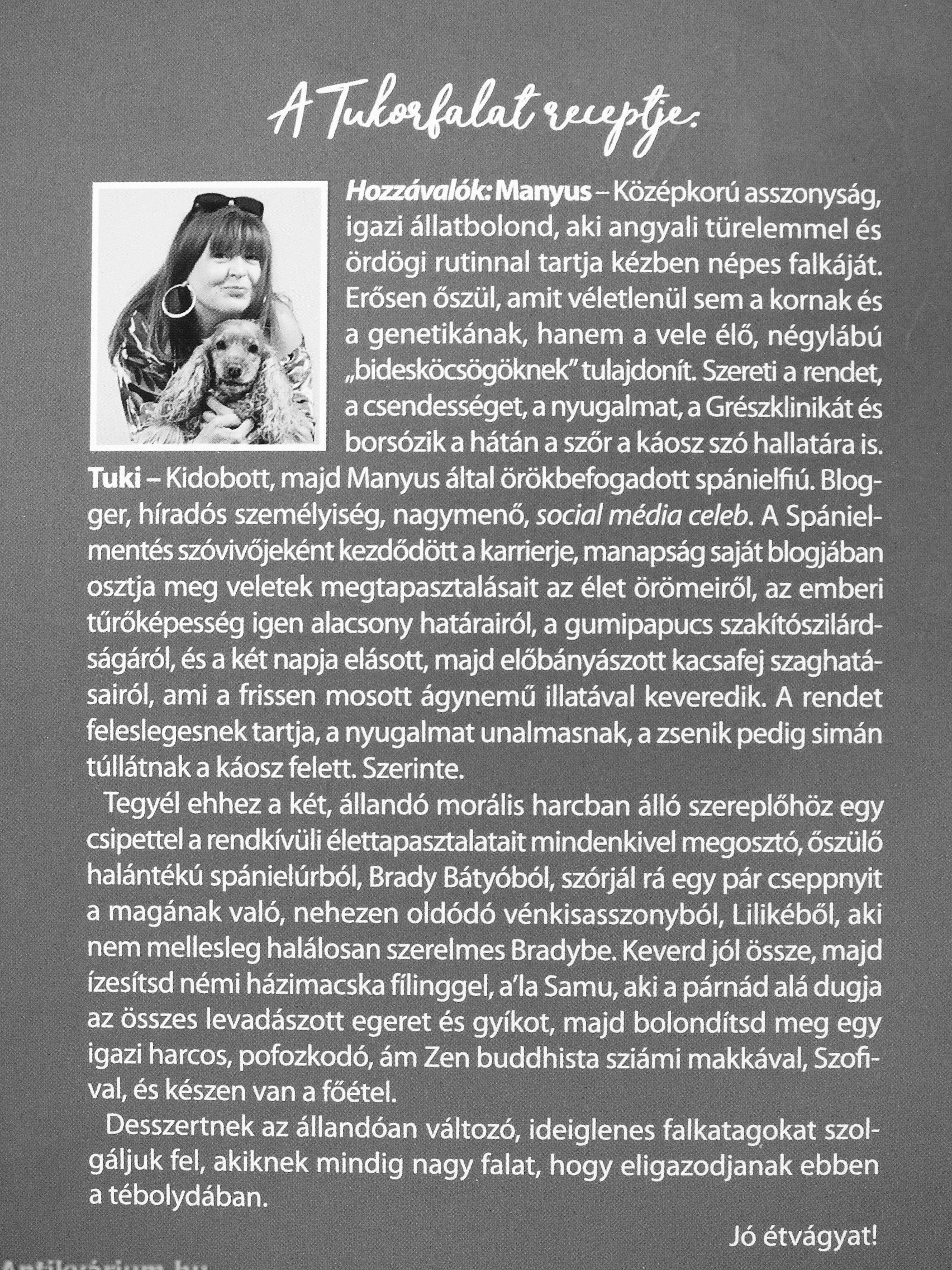 Kft^P^^BM a csendességet, a nyugalmat, a Grészklinikát és HiBlliflB^Di borsózik a hátán a szőr a káosz szó hallatára is. Tuki - Kidobott, majd Manyus által örökbefogadott spánielfiú. Blog-ger, híradós személyiség, nagymenő, social média celeb. A Spánielmentés szóvivőjeként kezdődött a karrierje, manapság saját blogjában osztja meg veletek megtapasztalásait az élet örömeiről, az emberi tűrőképesség igen alacsony határairól, a gumipapucs szakítószilárdságáról, és a két napja elásott, majd előbányászott kacsafej szaghatásairól, ami a frissen mosott ágynemű illatával keveredik. A rendet feleslegesnek tartja, a nyugalmat unalmasnak, a zsenik pedig simán túllátnak a káosz felett....